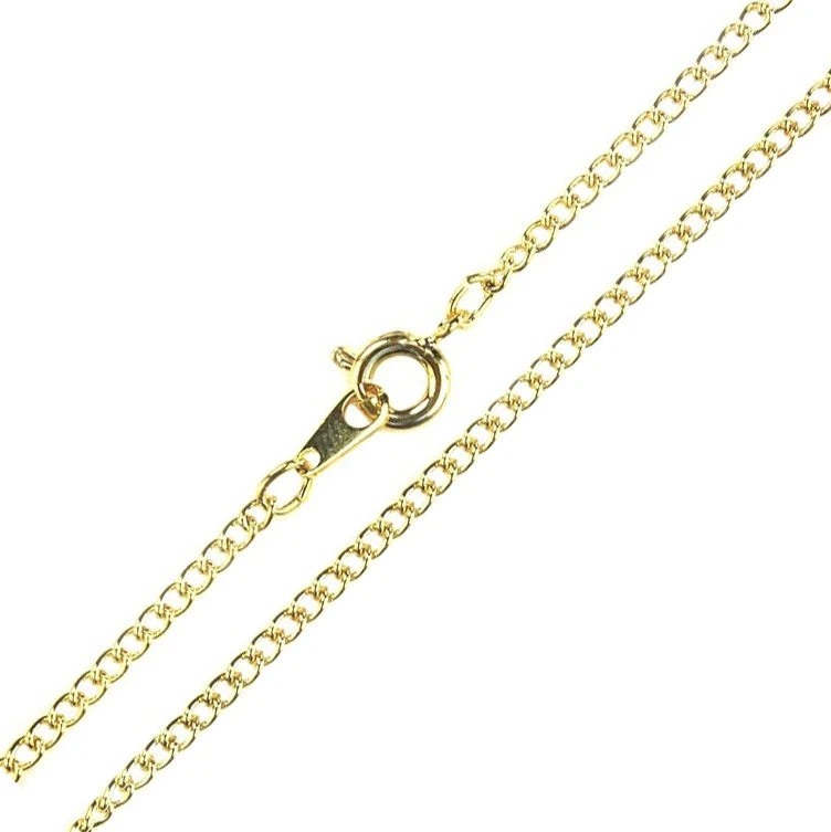 This gold plated Curb chain is a style of chain that has flat, interlocking links that lay close together, creating a smooth and sleek look. The links are slightly twisted, giving them an angled appearance and adding texture to the chain. As this chain is made of Plated metal, where a fine layer of gold has been bonded onto the brass base metal, over time and with excess use this layer may eventually wear away. All our plated metal findings are compliant with EU REACH regulations.