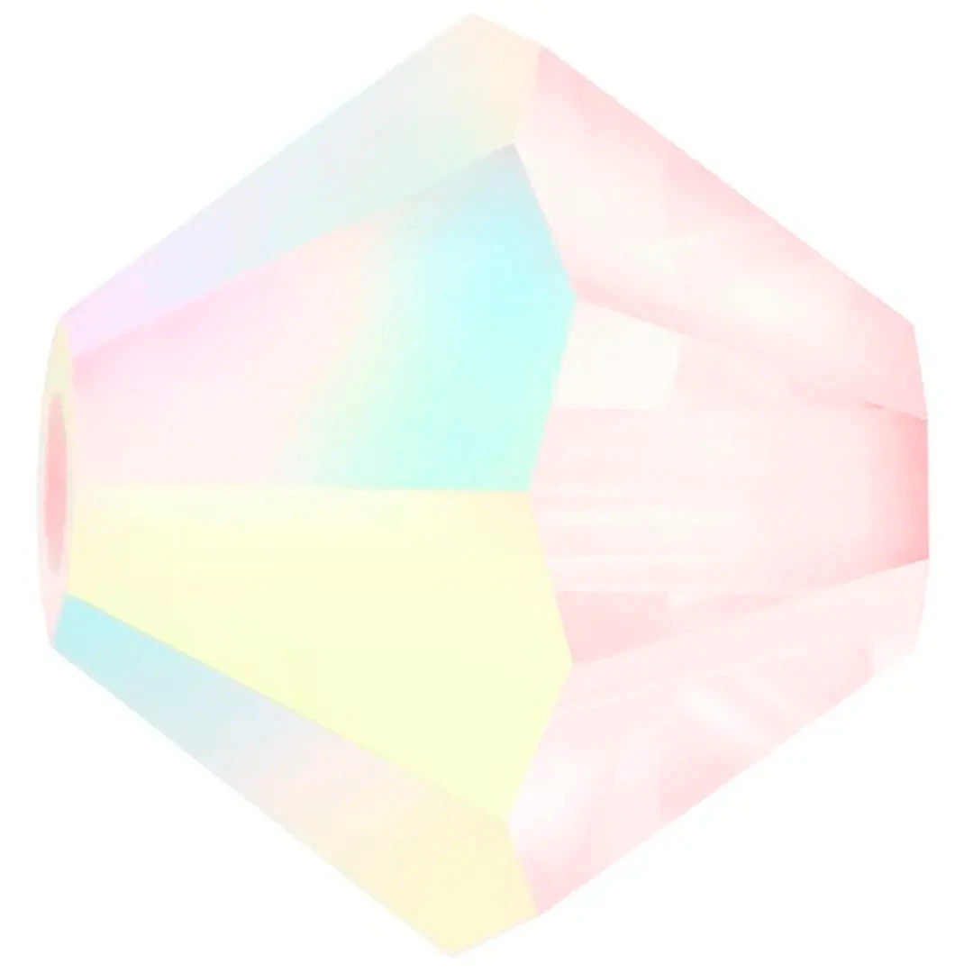 Preciosa crystal beads Bicone in Rose Opal AB have a smooth thread hole and are multi-faceted to reflect the light, making them perfect to create bespoke designs. Preciosa Bicone Beads have a cylindrical shape and taper towards both ends to create a unique bi-conical shape. The multi-faceted surface of these beads, which narrows towards each end, adds texture, depth, and sparkle to different jewellery and custom-made designs.
