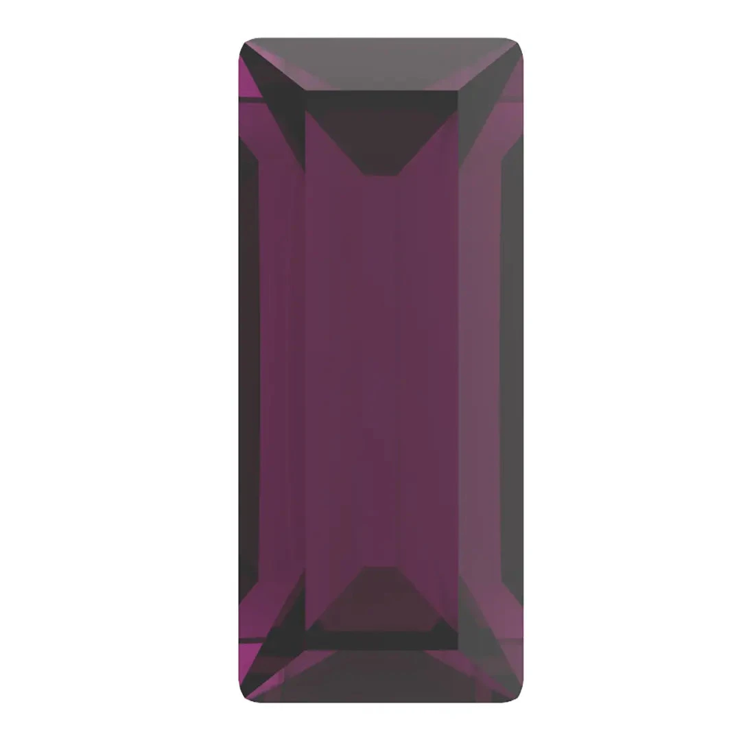 Preciosa fancy stones Baguette in Amethyst are multi faceted pointed back crystals that have no thread hole and can be applied to fabric or to create jewellery designs using metal settings or in pre-made cavities. Preciosa baguette shaped crystals have an elongated and slim form that resembles the French bread baguette. These rhinestones feature straight sides and pointed tips to emphasize their stretched-out appearance. The Preciosa baguette rhinestones are versatile in their use, as they can be utilized as a standalone crystal or in combination with other shaped crystals to create complex and eye-catching designs.