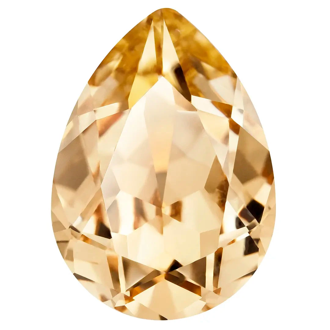 Preciosa fancy stones Baroque Pear in Crystal Honey are multi faceted pointed back crystals that have no thread hole and can be applied to fabric or to create jewellery designs using metal settings or in pre-made cavities. Preciosa baroque pear shape is designed to accentuate its unique and irregular pear shape, which resembles the flowing and asymmetrical forms found in Baroque art. The cut features multiple facets arranged in a way that enhances the crystal’s ability to reflect and refract light, creating a stunning display of sparkle and brilliance. The precise and symmetrical faceting of the crystal ensures that its shine and sparkle are consistent from one piece to another, while the baroque pear shape adds a touch of individuality and character to each crystal.