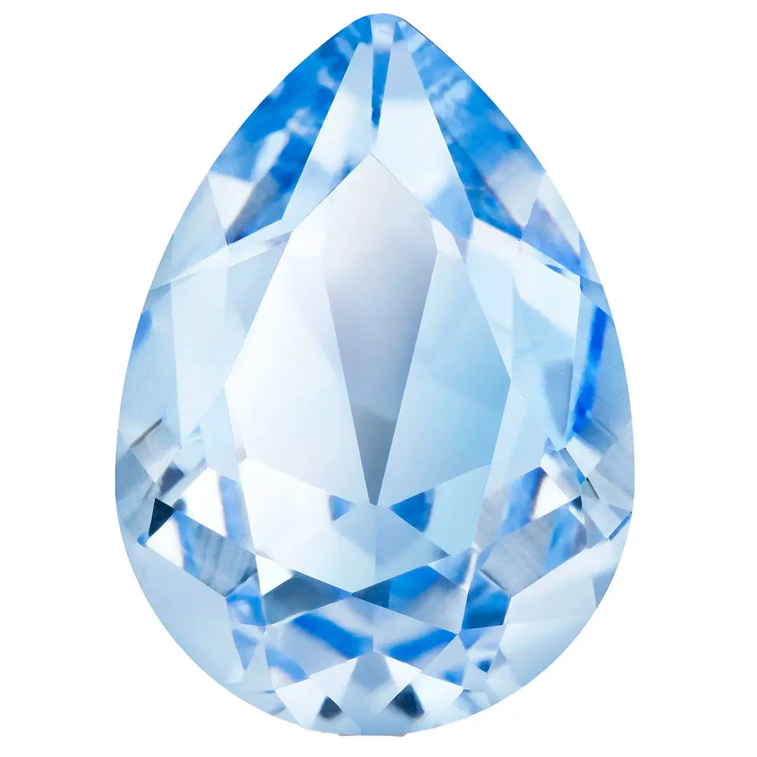 Preciosa fancy stones Baroque Pear in Aqua Bohemica are multi faceted pointed back crystals that have no thread hole and can be applied to fabric or to create jewellery designs using metal settings or in pre-made cavities. Preciosa baroque pear shape is designed to accentuate its unique and irregular pear shape, which resembles the flowing and asymmetrical forms found in Baroque art. The cut features multiple facets arranged in a way that enhances the crystal’s ability to reflect and refract light, creating a stunning display of sparkle and brilliance. The precise and symmetrical faceting of the crystal ensures that its shine and sparkle are consistent from one piece to another, while the baroque pear shape adds a touch of individuality and character to each crystal.