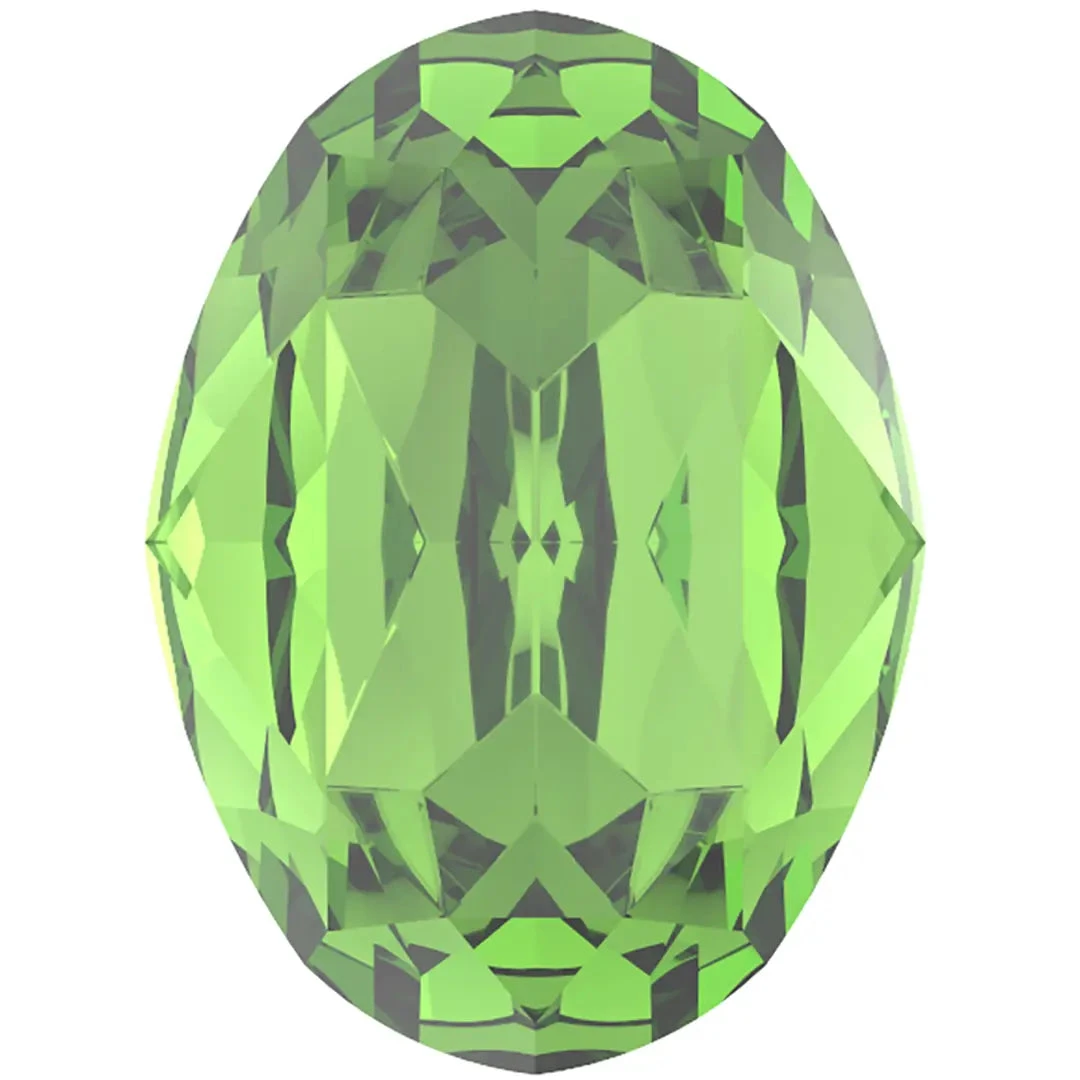 Preciosa fancy stones Oval in Peridot are multi faceted pointed back crystals that have no thread hole and can be applied to fabric or to create jewellery designs using metal settings or in pre-made cavities. Preciosa oval shaped crystals feature an elongated and egg-shaped design, with two rounded ends that have been skillfully faceted to produce a breathtaking multi-dimensional effect.