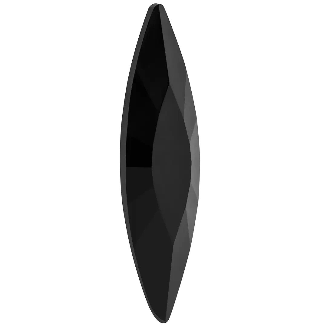 Preciosa fancy stones Slim Navette in Jet UNFOILED are multi faceted pointed back crystals that have no thread hole and can be applied to fabric or to create jewellery designs using metal settings or in pre-made cavities. Preciosa slim navette shaped crystals have an elongated and pointed shape at both ends, resembling a narrow leaf or an almond, hence the name “navette” which is derived from the French word for “little boat”. The flat top surface of the crystal is surrounded by bevelled edges that catch and reflect light, creating a brilliant and sparkling effect that enhances the overall appearance of the crystal.