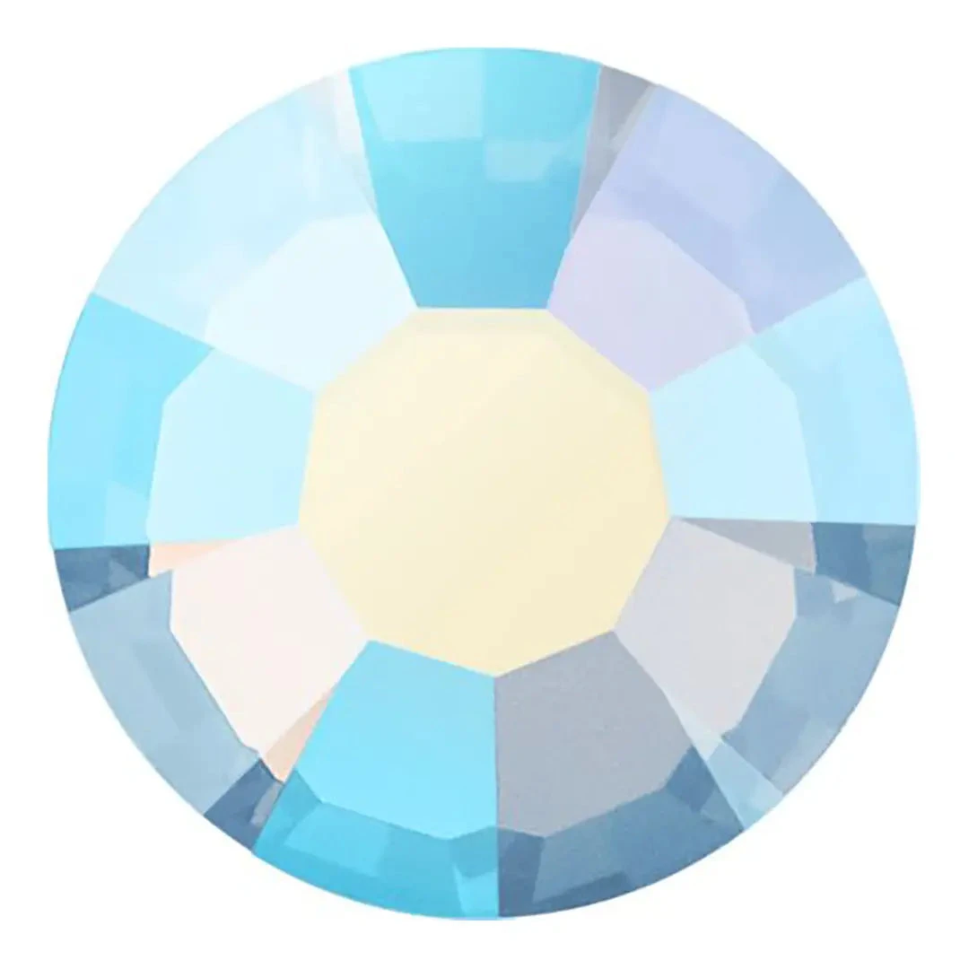 Light Sapphire Opal AB are flat back crystals that can easily be applied to most surfaces with glue. Light Sapphire is a popular colour in jewellery design, and is also used in fashion and dance wear to create a soft and serene ambiance. Light Sapphire pairs well with other colours, such as pale pink and lavender, as well as neutral shades like white and grey. Light Sapphire is a versatile and attractive colour that can add a touch of elegance and sophistication to any design project. Opal gives the colour a milky appearance due to the colouring in the glass being slightly opaque. The AB (Aurora Borealis) effect is an iridescent coating that covers the top of the crystal, making it shimmer like a rainbow. The base colour of the crystal can still be seen underneath but there is a noticeable pink and blue shine to it as it hits the light.