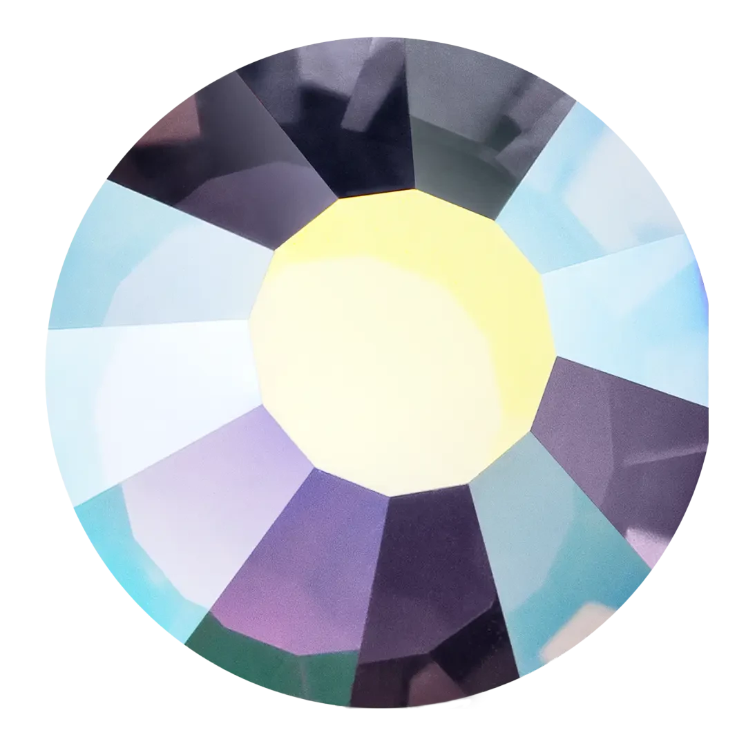 Preciosa rhinestones non hotfix round (MAXIMA) in Lilac Ash AB are flat back crystals that can easily be applied to most surfaces with glue. Lilac Ash AB is a delicate, cool-toned shade that combines soft lavender with a hint of grey or silver, giving it an ethereal and slightly muted appearance. The lilac aspect provides a gentle purple hue, while the “ash” component introduces a subtle, smoky undertone, making the colour feel more refined and subdued. This combination creates a pastel-like shade that is both elegant and modern, with a sophisticated, almost silvery quality that makes it versatile and easy to pair with other colours. The AB (Aurora Borealis) effect is an iridescent coating that covers the top of the crystal, making it shimmer like a rainbow. The base colour of the crystal can still be seen underneath but there is a noticeable pink and blue shine to it as it hits the light.