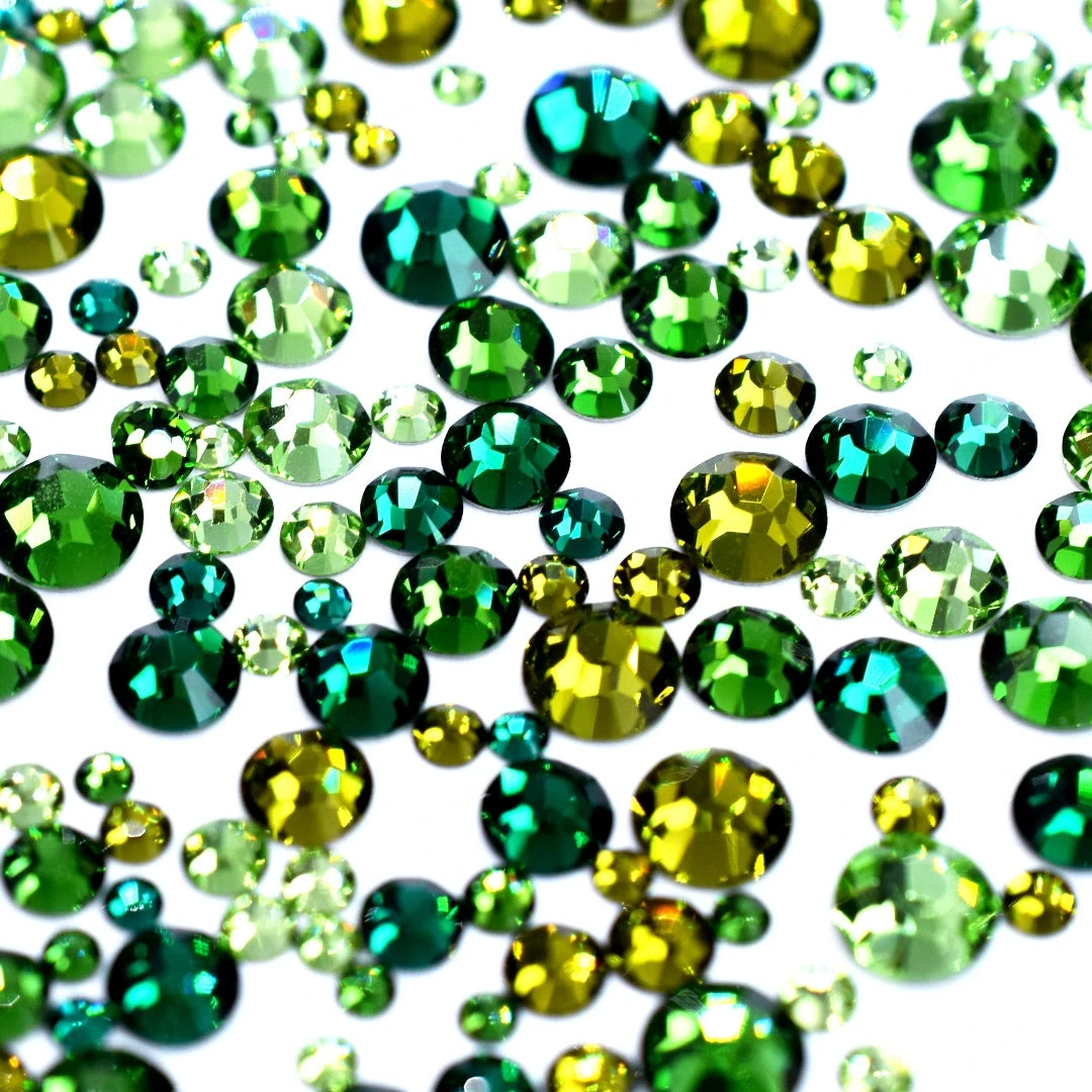 Preciosa rhinestones Forest Green mix contains a variety of round flat back crystals in a blend of green colours. Popular with nail technicians and embellishment artists, this mix is a cost effective way to purchase a selection of different crystals.