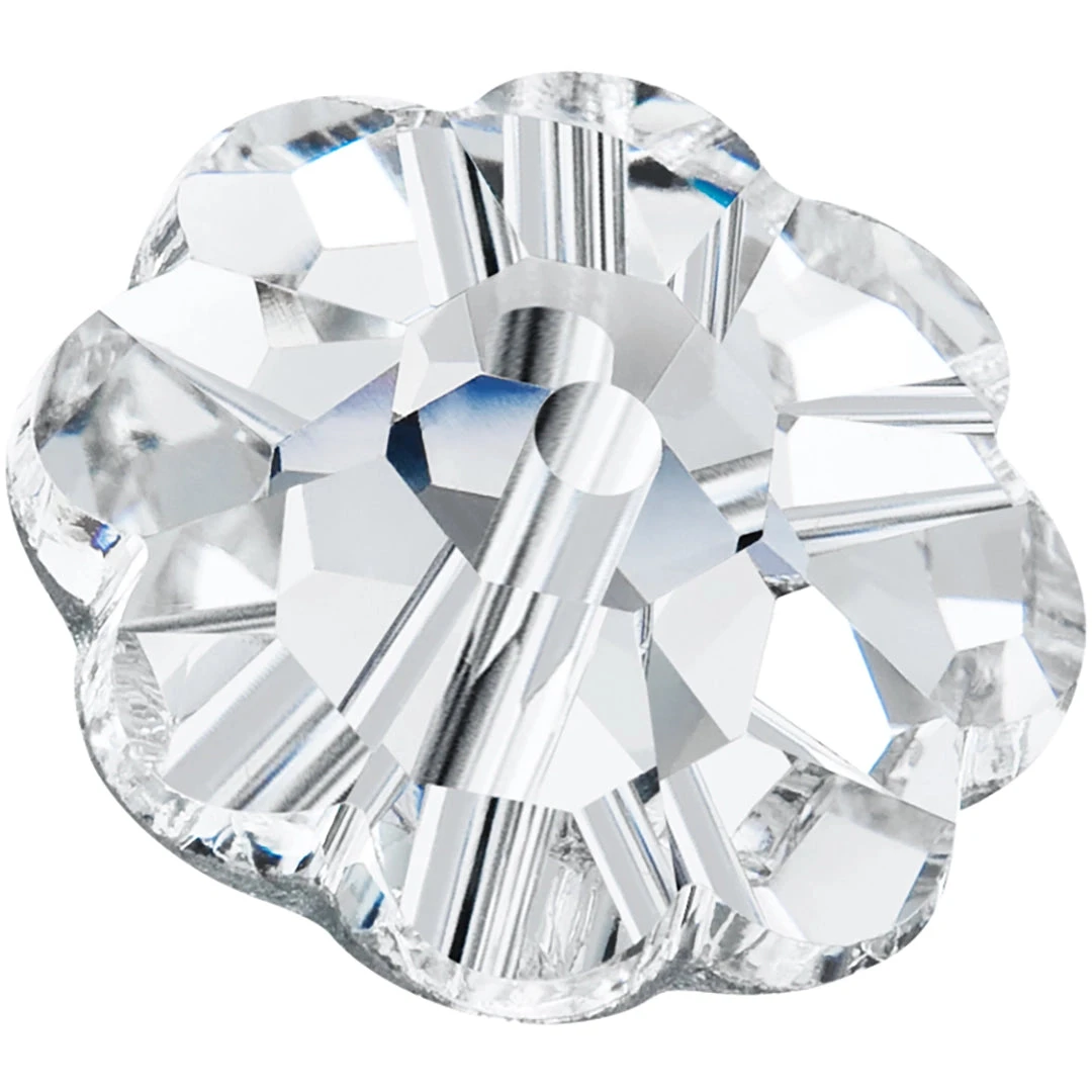 Preciosa sew on crystals Flower (1 Hole) in Crystal UNFOILED are loose flat backed crystals that come with a thread hole, enabling the crystals to be sewn onto fabric. Preciosa flower shaped sew-ons are designed in the shape of a daisy, with soft, rounded edge petals extending from the center of the crystal. The facets of the crystal are arranged in such a way that they lead towards the center from each of the petals, resulting in a distinctive focal point for any design.