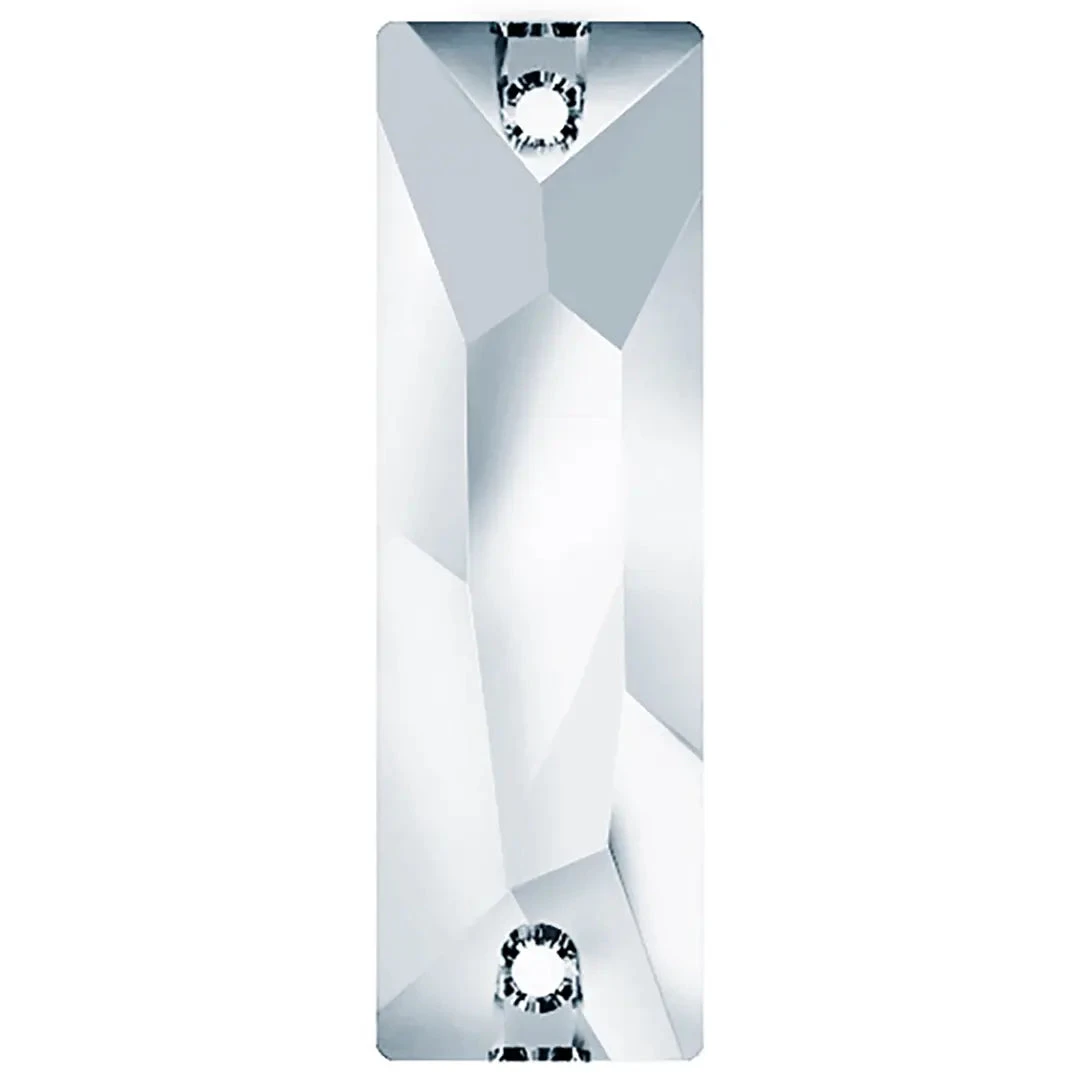 Preciosa sew on crystals Slim Baguette (2 Hole) in Crystal are loose flat backed crystals that come with a thread hole, enabling the crystals to be sewn onto fabric. Preciosa Slim Baguette shaped sew-ons have an elongated and slim form that resembles the French bread baguette. These rhinestones feature straight sides and pointed tips to emphasize their stretched-out appearance. The Preciosa slim baguette has the same overall shape as the standard baguette, but is more elongated.