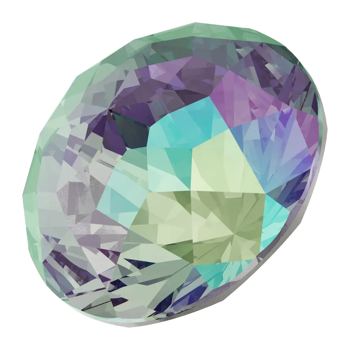 Crystal Paradise Shine combines the contrasting colours of green and purple, with green being a cool colour and purple being a warm colour, creating a unique and interesting contrast that can be used to create visually striking designs. The muted sage green and lavender purple of Crystal Paradise Shine creates a subdued and calming effect, changing colour slightly as the crystal moves. The combination of these two colours can create a sense of balance between the natural and the artistic, making it a popular choice for sport and dance wear.