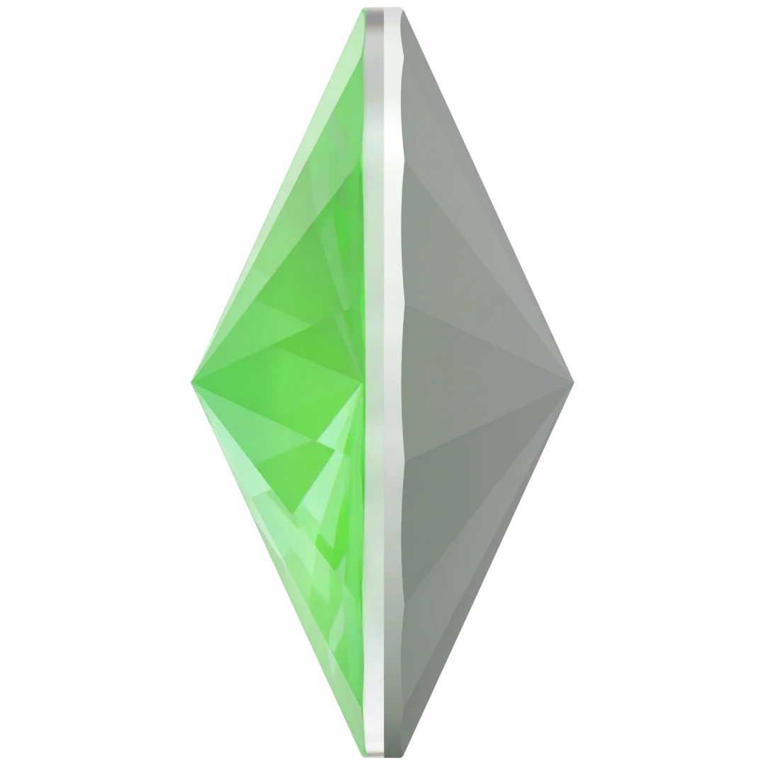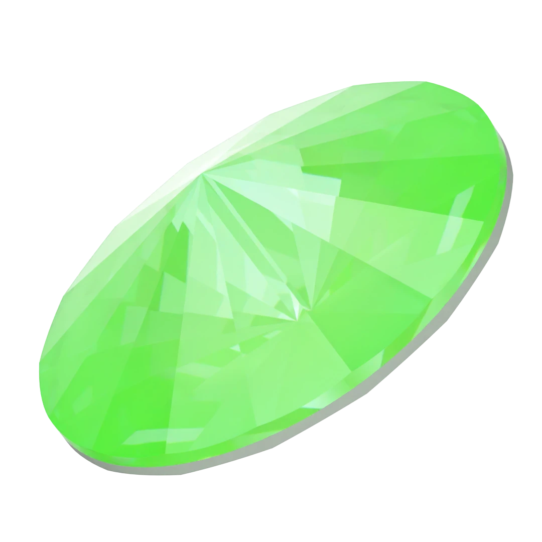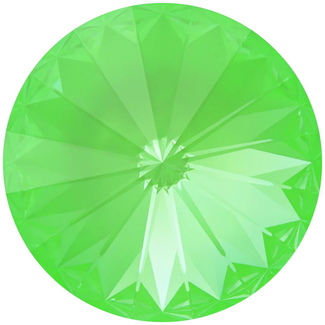 Serinity chatons Rivoli (1122) in Crystal Electric Green Ignite UNFOILED are multi faceted pointed back crystals that are used with metal settings to create bespoke jewellery and embellishment designs. Serinity Rivoli shaped crystals are uniformly cut glass stones with facets that converge to a point. The underside of the crystal is foiled to reflect light and intensify the colour of the stone, creating a brilliant shine.