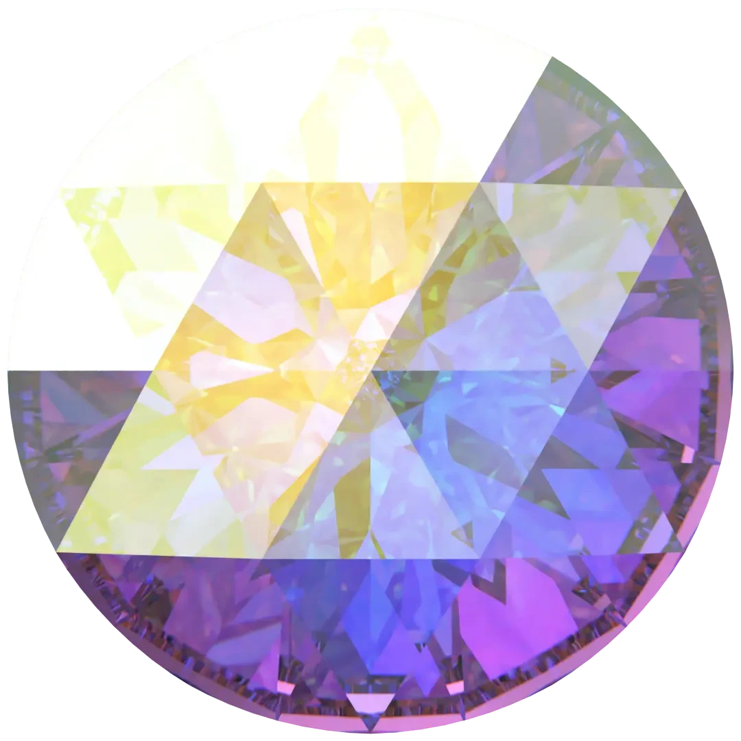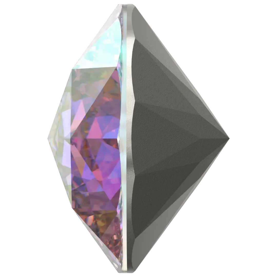 Serinity chatons Round Rose Cut (1401) in Crystal AB are multi faceted pointed back crystals that are used with metal settings to create bespoke jewellery and embellishment designs. Serinity Rose Cut shaped crystals are circular in shape and cut in a unique faceting pattern. These crystals have a flat base and a rounded top with triangular facets arranged in a circular pattern around the centre, resulting in a multidimensional and captivating appearance.