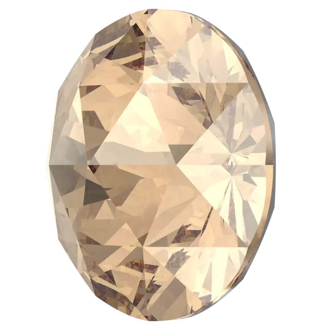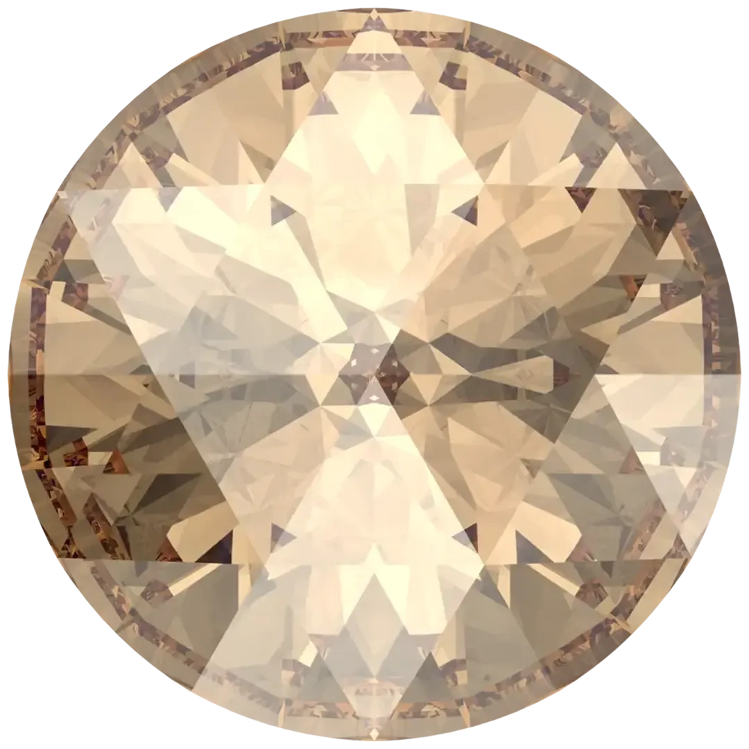 Serinity chatons Round Rose Cut (1401) in Crystal Golden Shadow are multi faceted pointed back crystals that are used with metal settings to create bespoke jewellery and embellishment designs. Serinity Rose Cut shaped crystals are circular in shape and cut in a unique faceting pattern. These crystals have a flat base and a rounded top with triangular facets arranged in a circular pattern around the centre, resulting in a multidimensional and captivating appearance.