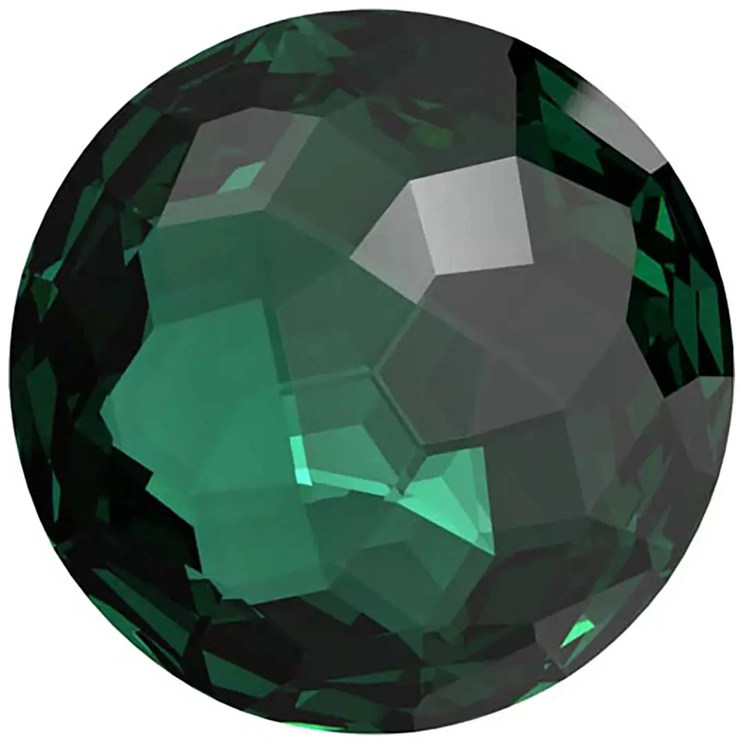 Serinity chatons Thin (1383) in Emerald are multi faceted pointed back crystals that are used with metal settings to create bespoke jewellery and embellishment designs. Serinity Thin chaton is circular in shape with a distinctive, uneven faceting design that produces an enchanting interplay of light and colour. The facets are arranged in such a way that they create a kaleidoscope-like effect, showcasing various colours and shapes when viewed from different angles.