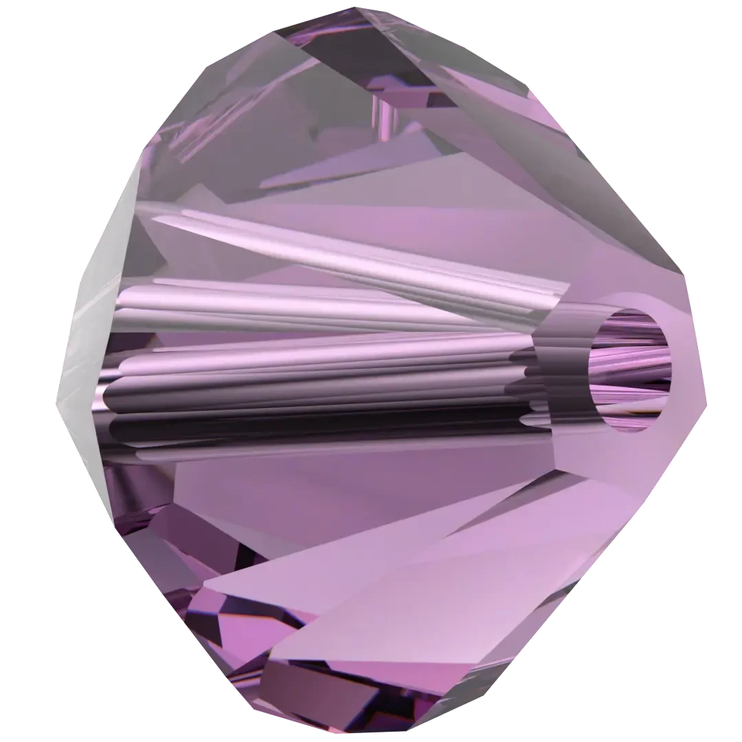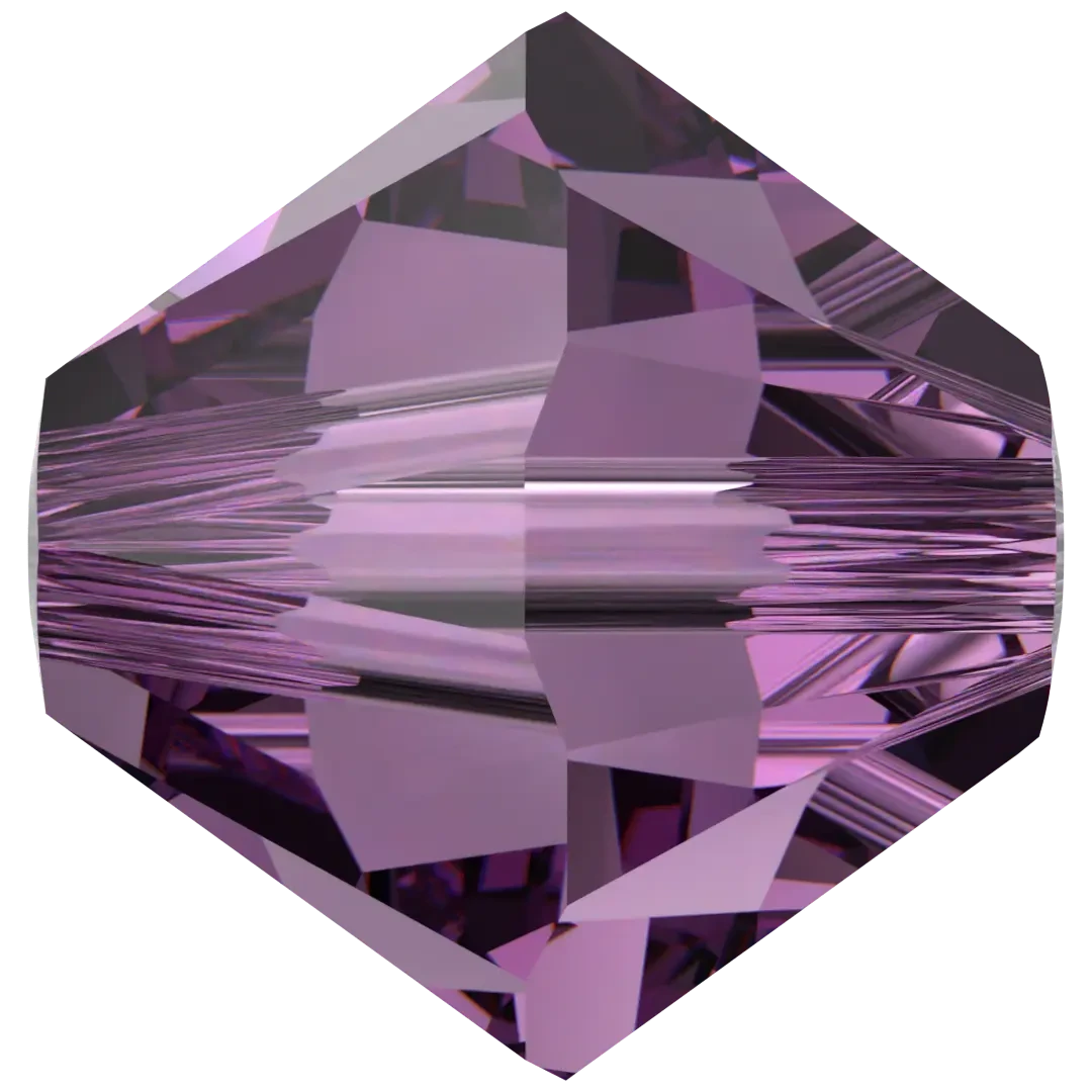Serinity crystal beads Bicone (5328) in Amethyst have a smooth thread hole and are multi-faceted to reflect the light, making them perfect to create bespoke designs. Serinity Bicone beads are cylindrical in shape and narrow down at both ends to create a distinctive bi-conical shape. The multi-faceted surface of these beads, which tapers towards each end, adds texture, depth, and shine to various jewellery and customized designs.