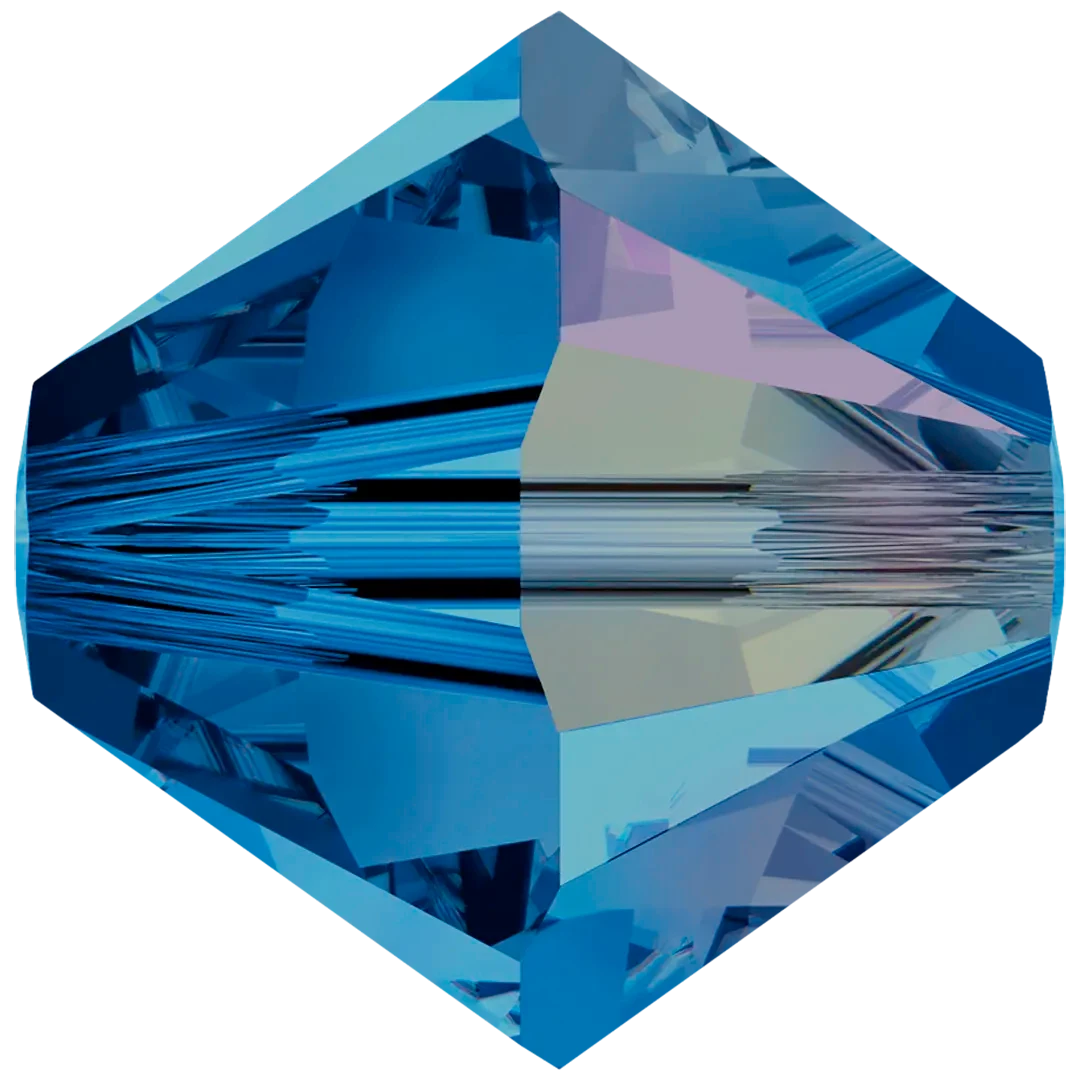 Serinity crystal beads Bicone (5328) in Capri Blue AB have a smooth thread hole and are multi-faceted to reflect the light, making them perfect to create bespoke designs. Serinity Bicone beads are cylindrical in shape and narrow down at both ends to create a distinctive bi-conical shape. The multi-faceted surface of these beads, which tapers towards each end, adds texture, depth, and shine to various jewellery and customized designs.