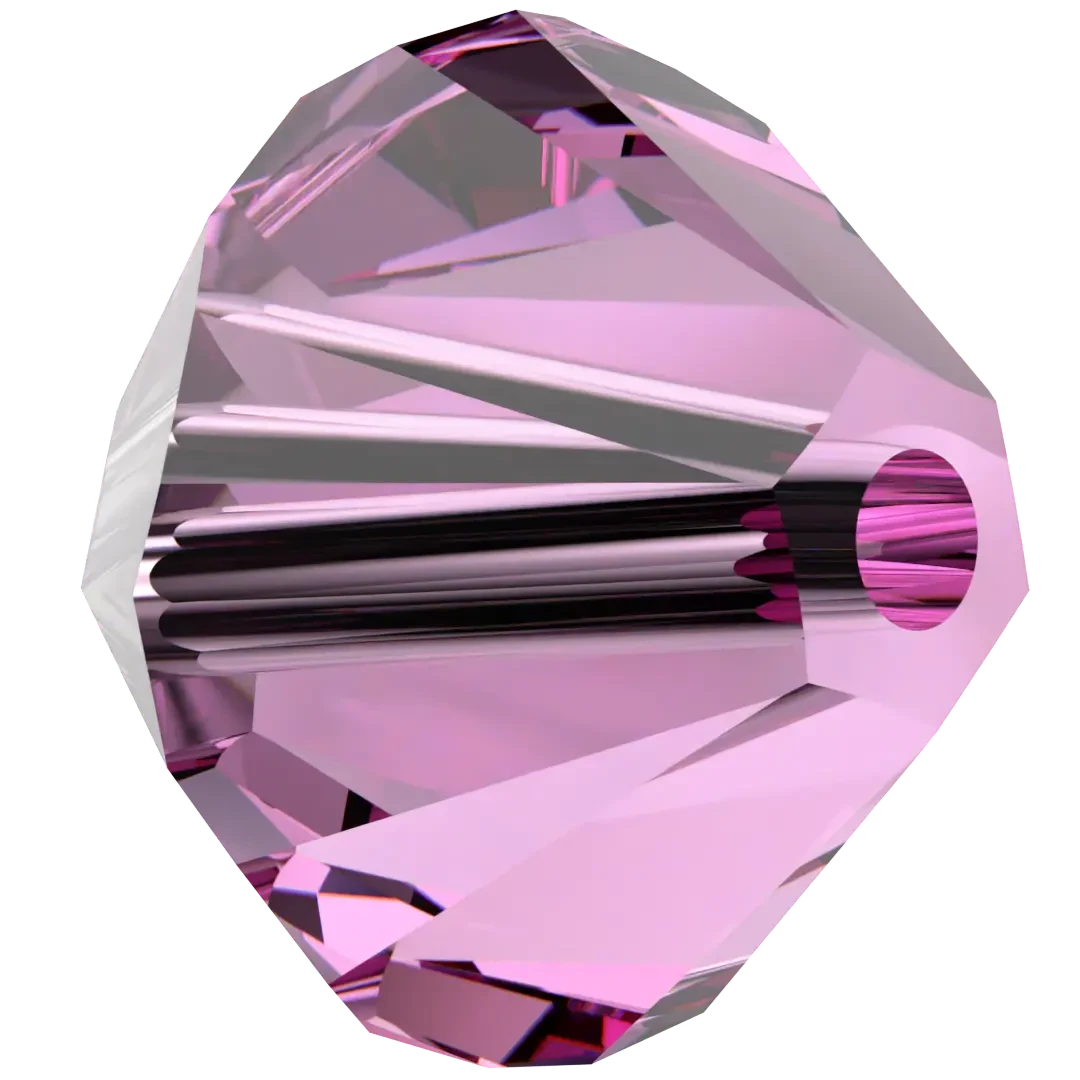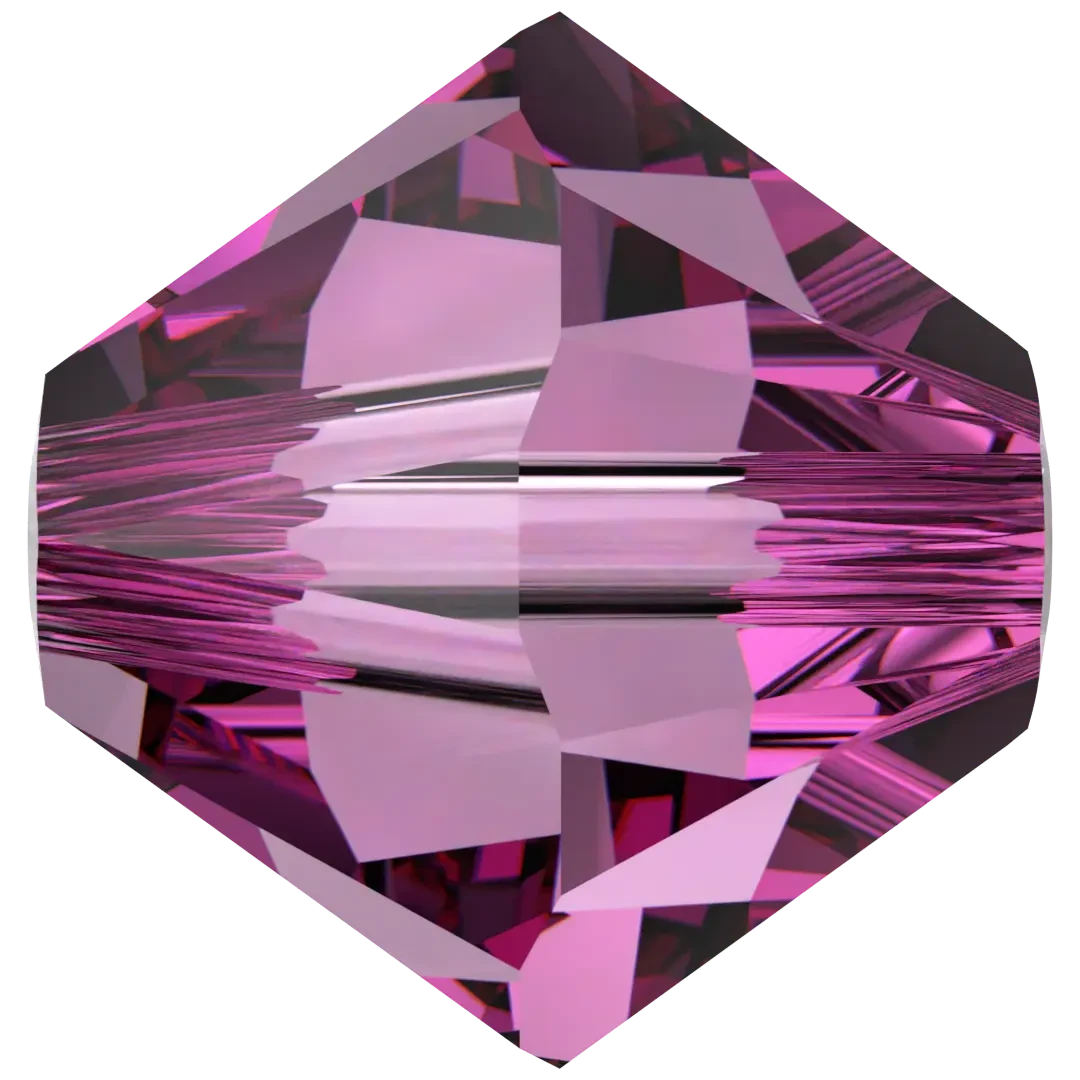 Serinity crystal beads Xilion Bicone (5328) in Dark Rose have a smooth thread hole and are multi-faceted to reflect the light, making them perfect to create bespoke designs. Serinity Bicone beads are cylindrical in shape and narrow down at both ends to create a distinctive bi-conical shape. The multi-faceted surface of these beads, which tapers towards each end, adds texture, depth, and shine to various jewellery and customized designs.