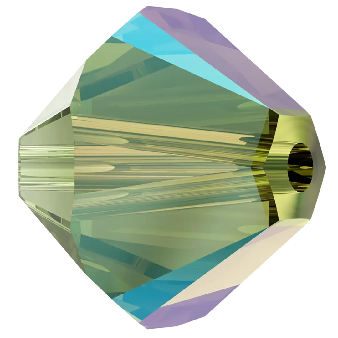 Serinity crystal beads Bicone (5328) in Peridot Shimmer have a smooth thread hole and are multi-faceted to reflect the light, making them perfect to create bespoke designs. Serinity Bicone beads are cylindrical in shape and narrow down at both ends to create a distinctive bi-conical shape. The multi-faceted surface of these beads, which tapers towards each end, adds texture, depth, and shine to various jewellery and customized designs.