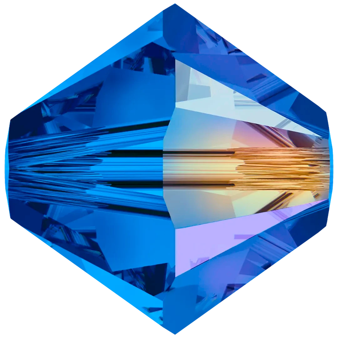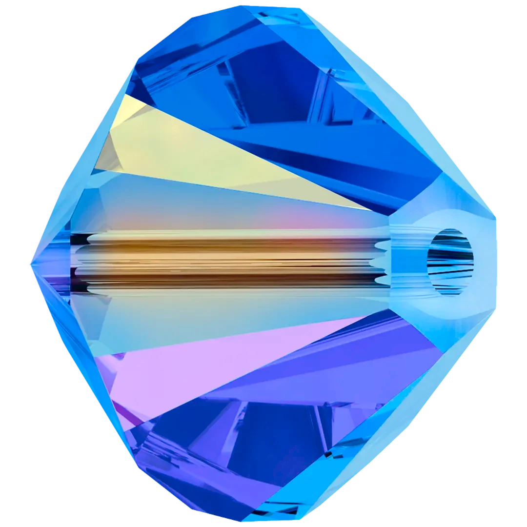 Serinity crystal beads Bicone (5328) in Sapphire AB have a smooth thread hole and are multi-faceted to reflect the light, making them perfect to create bespoke designs. Serinity Bicone beads are cylindrical in shape and narrow down at both ends to create a distinctive bi-conical shape. The multi-faceted surface of these beads, which tapers towards each end, adds texture, depth, and shine to various jewellery and customized designs.