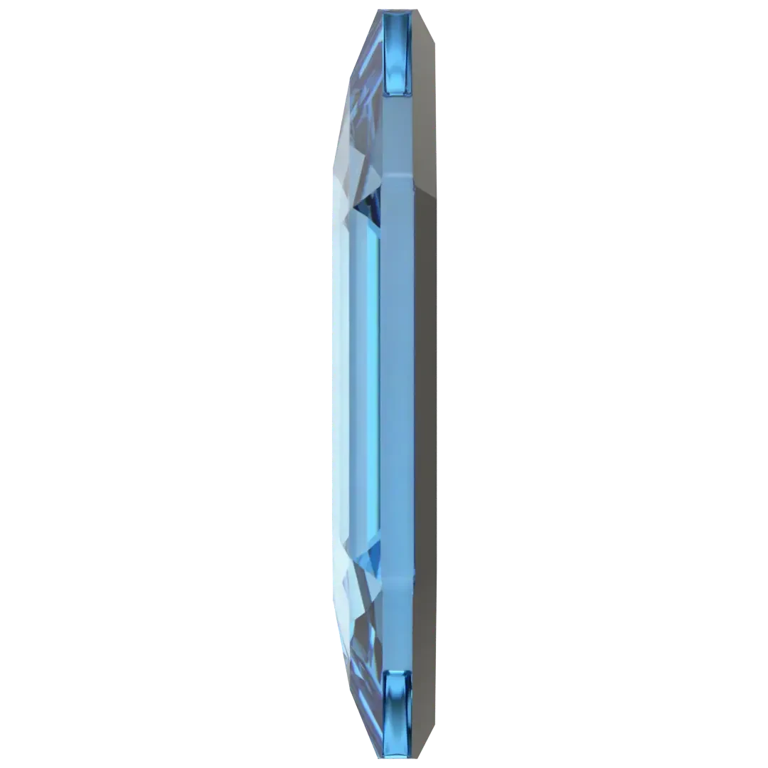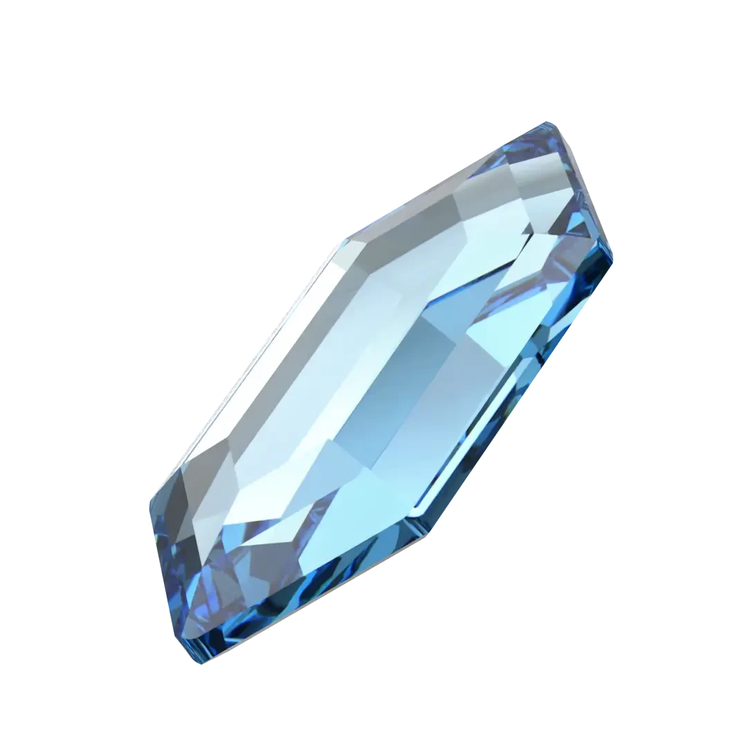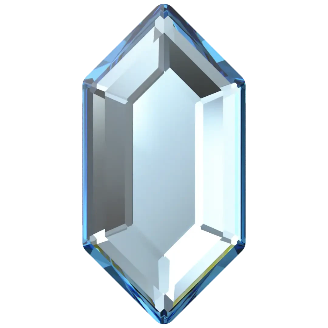 Serinity rhinestones non hotfix Large Hexagon (2776) in Aquamarine are flat back crystals that can easily be applied to most surfaces with glue. Serinity Large Hexagon flat back crystal showcases an exceptional hexagonal structure with elongated sides, providing it with a more slender and stretched-out appearance compared to a standard hexagon. The crystal exhibits a flat top surface and bevelled edges that catch and reflect light, generating an impressive and sparkling effect.