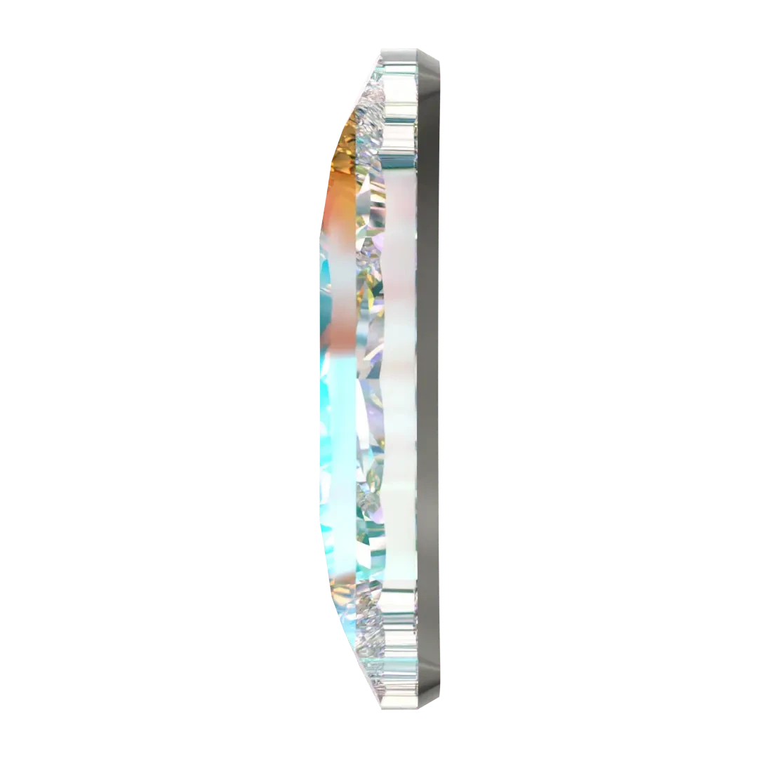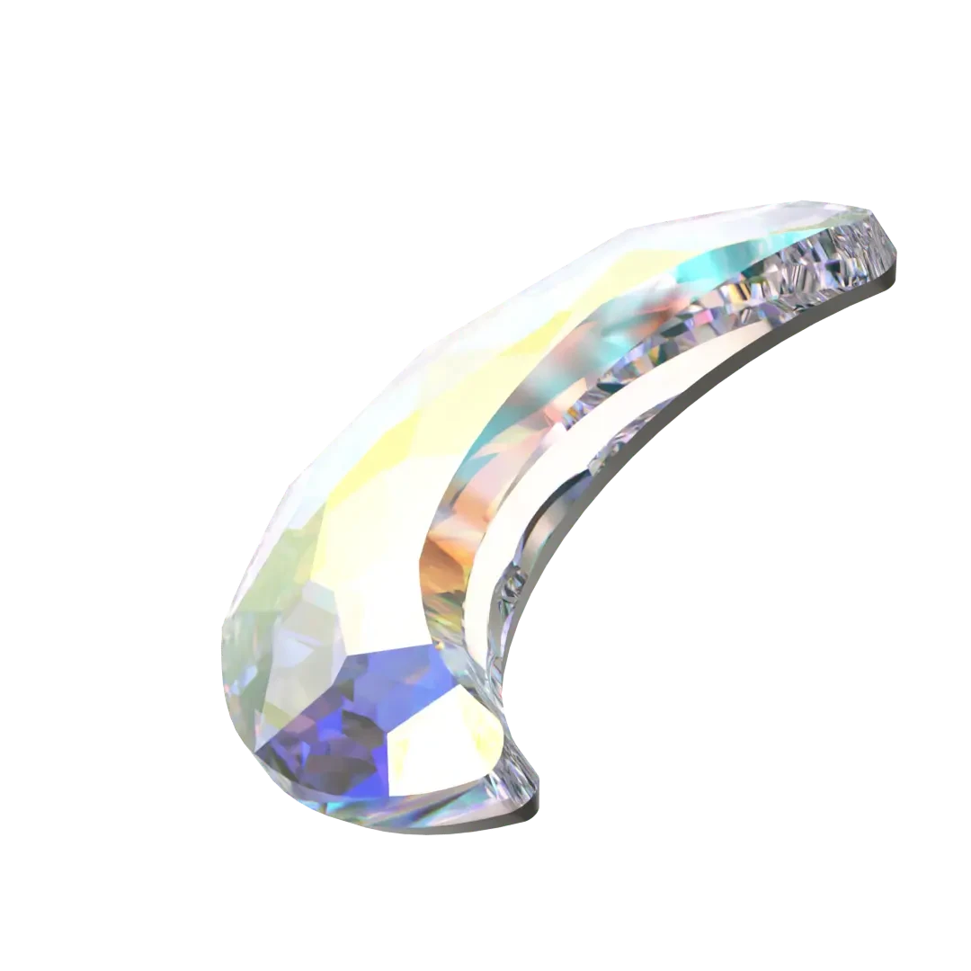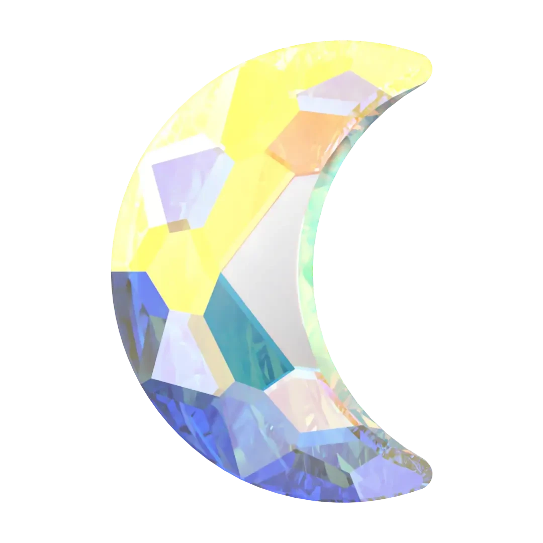 Serinity rhinestones non hotfix Moon (2813) in Crystal AB are flat back crystals that can easily be applied to most surfaces with glue. Serinity Moon shaped crystals have a unique crescent or half-moon shape that features a rounded and curved surface on one side, while the other side is flat. These crystals are carefully cut and faceted to create a multi-dimensional effect that enhances their sparkle and radiance, making them a popular choice for jewellery and fashion design.