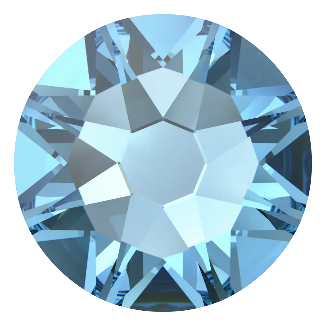 Serinity hotfix crystals Round (2000, 2038 & 2078) in Aquamarine are flat back crystals where the reverse side of the crystal has been pre-coated with a heat-sensitive glue. Aquamarine is a pale blue-green colour that resembles the hue of the water in the sea. It is a soft, cool, and calming colour that exudes a gentle and refreshing energy. Aquamarine resembles the colour of the gemstone it is named after, which is a light blue or greenish-blue. It is a soothing and serene colour that inspires feelings of tranquillity, relaxation, and clarity. Aquamarine is often associated with the ocean, the sky, and the fresh and cheerful spirit of spring.