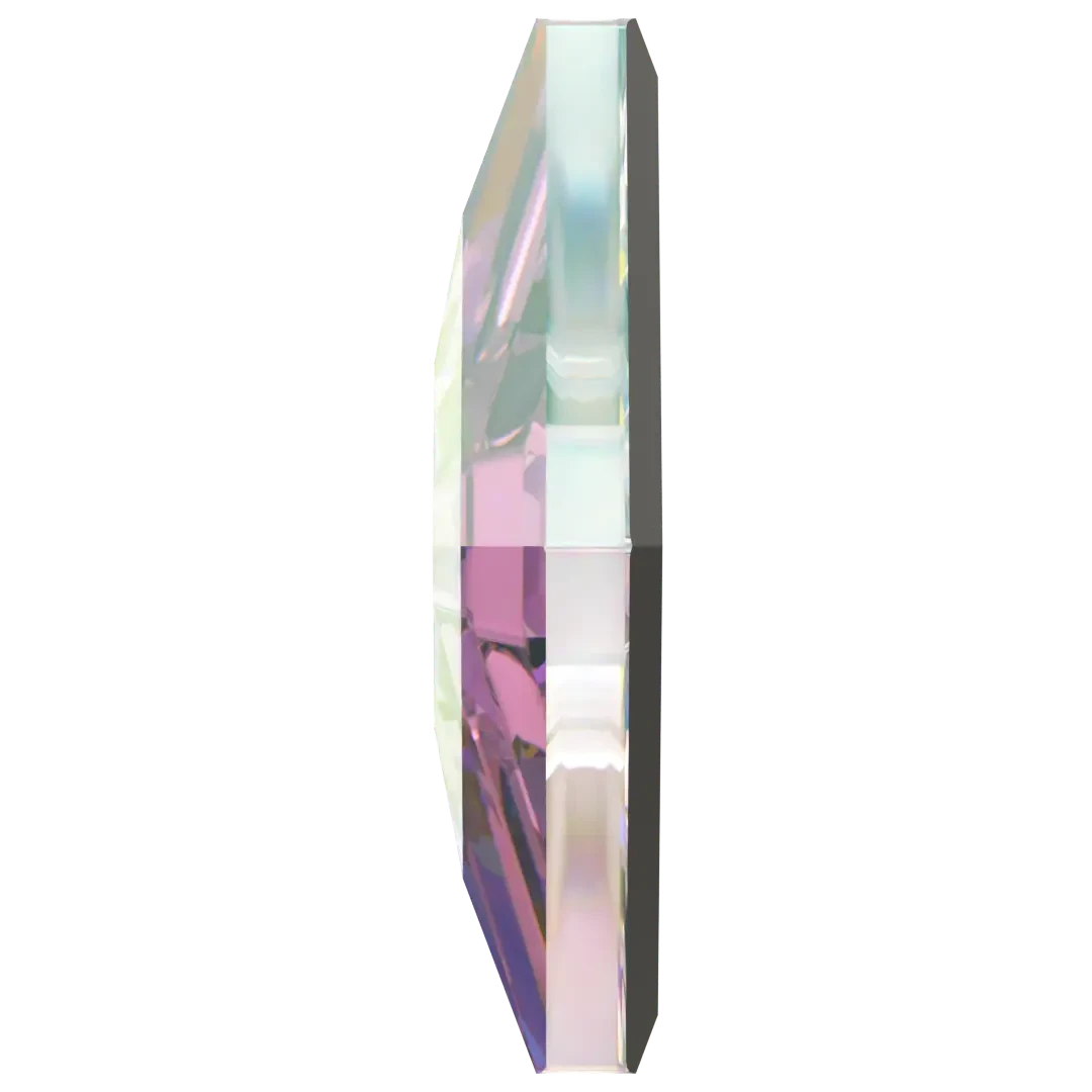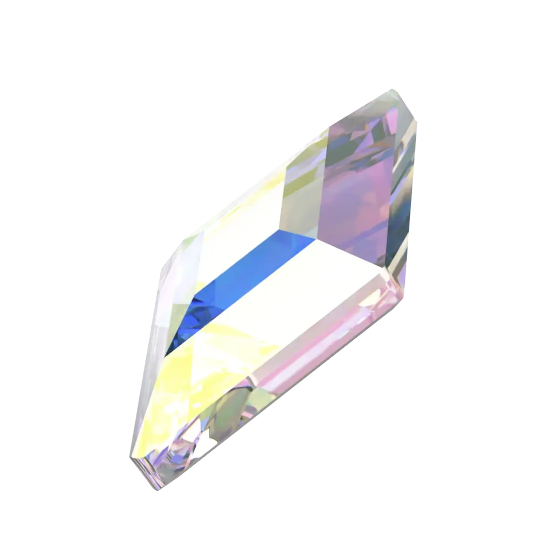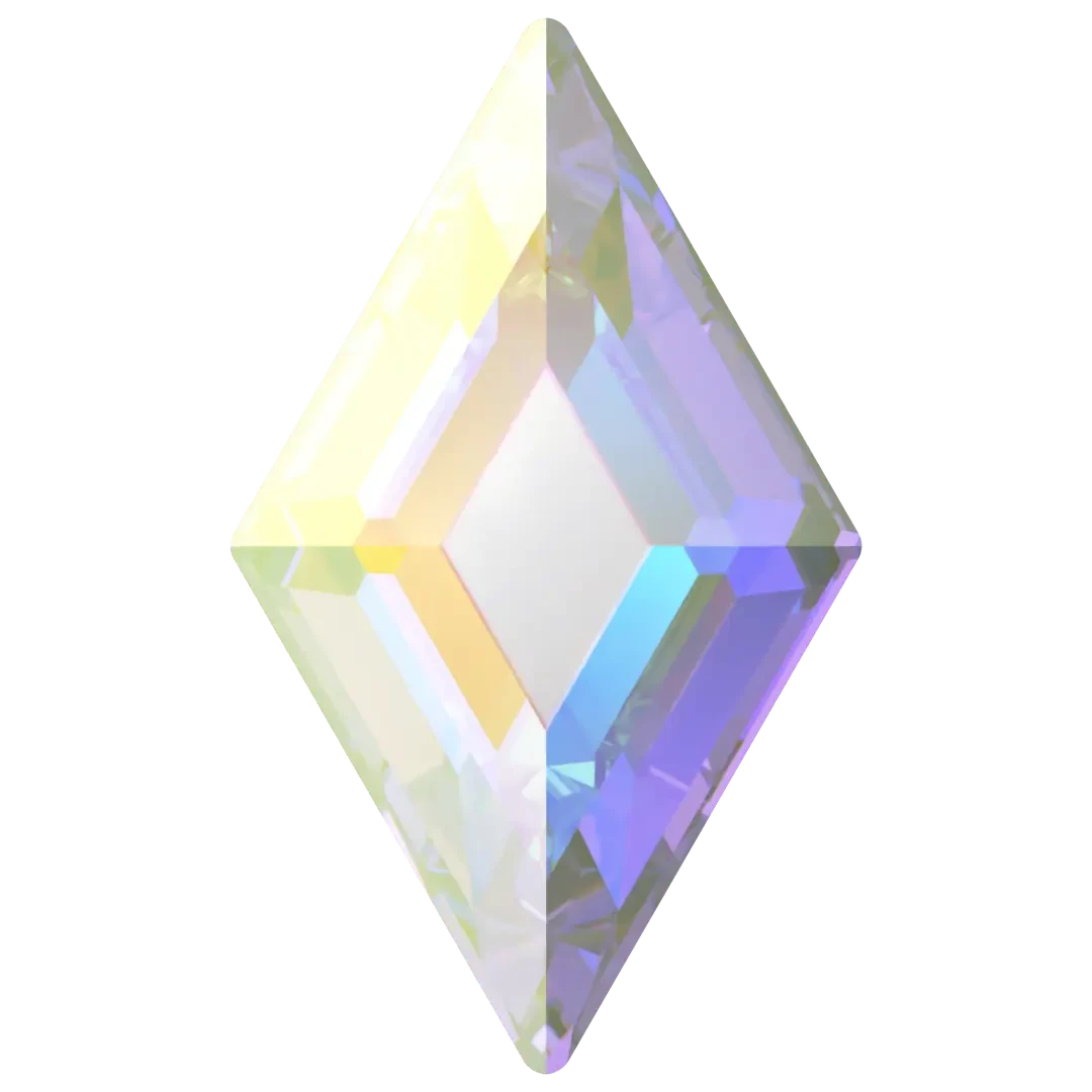 Serinity hotfix crystals Diamond (2773) in Crystal AB are flat back crystals where the reverse side of the crystal has been pre-coated with a heat-sensitive glue. Serinity Diamond shaped flat back crystals possess a precise and symmetrical diamond shape with a pointed top. These crystals are known for their ability to reflect light and create an eye-catching sparkle due to the specific arrangement of their facets.