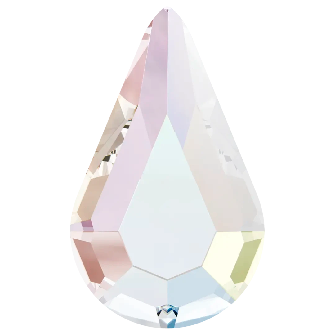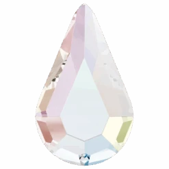 Serinity hotfix crystals Drop (2300) Crystal AB are flat back crystals where the reverse side of the crystal has been pre-coated with a heat-sensitive glue. Serinity Drop shaped crystals feature a unique teardrop design that tapers from a smaller top to a wider bottom, giving it the appearance of a droplet or tear. The crystal has a flat top surface and bevelled sides that allow it to reflect light and create a dazzling effect as it moves.
