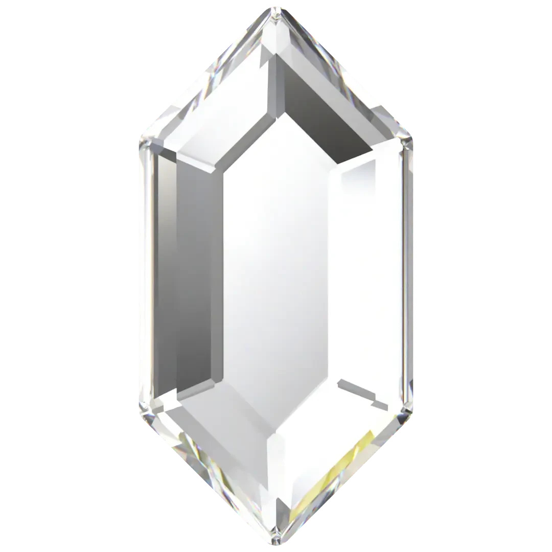 Serinity hotfix crystals Large Hexagon (2776) in Crystal are flat back crystals where the reverse side of the crystal has been pre-coated with a heat-sensitive glue. Serinity Large Hexagon flat back crystal showcases an exceptional hexagonal structure with elongated sides, providing it with a more slender and stretched-out appearance compared to a standard hexagon. The crystal exhibits a flat top surface and bevelled edges that catch and reflect light, generating an impressive and sparkling effect.