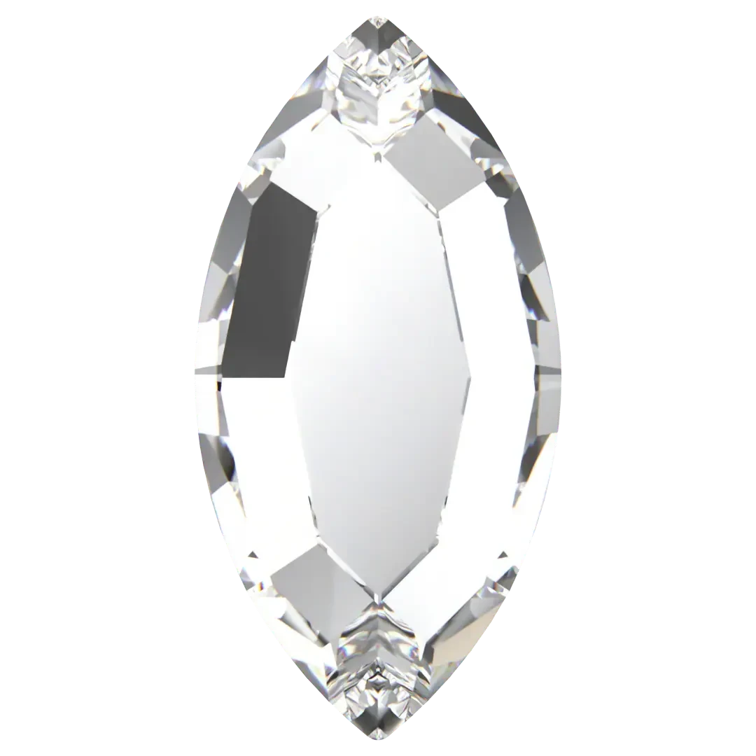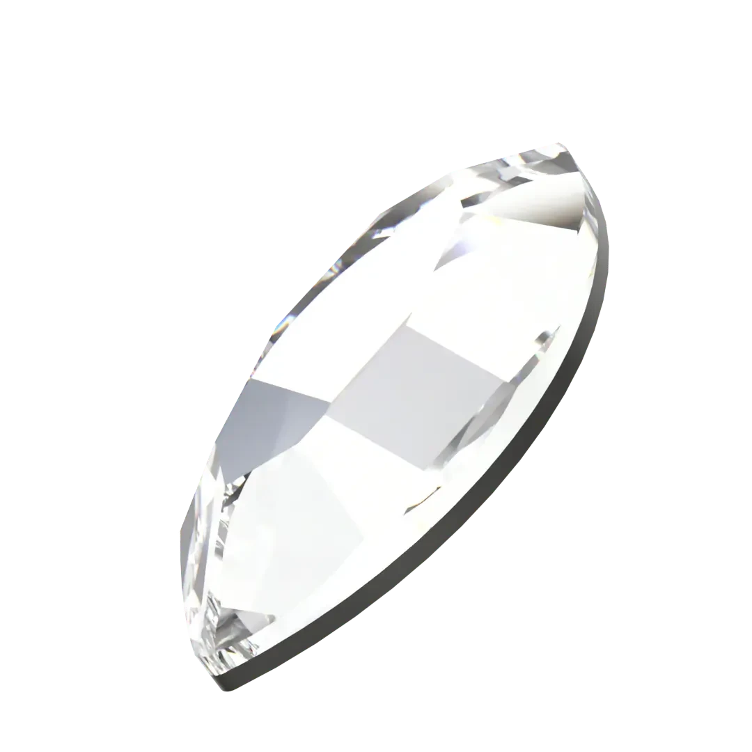 Serinity hotfix crystals Navette (2200) in Crystal are flat back crystals where the reverse side of the crystal has been pre-coated with a heat-sensitive glue. Serinity Navette shaped crystals are elongated and pointed at both ends, resembling a narrow leaf or an almond. The name “Navette” is derived from the French word for “little boat,” as the shape of the crystal is reminiscent of a boat’s hull. The crystal has a flat top surface and bevelled edges that catch and reflect light, creating a sparkling effect that enhances its overall appearance.