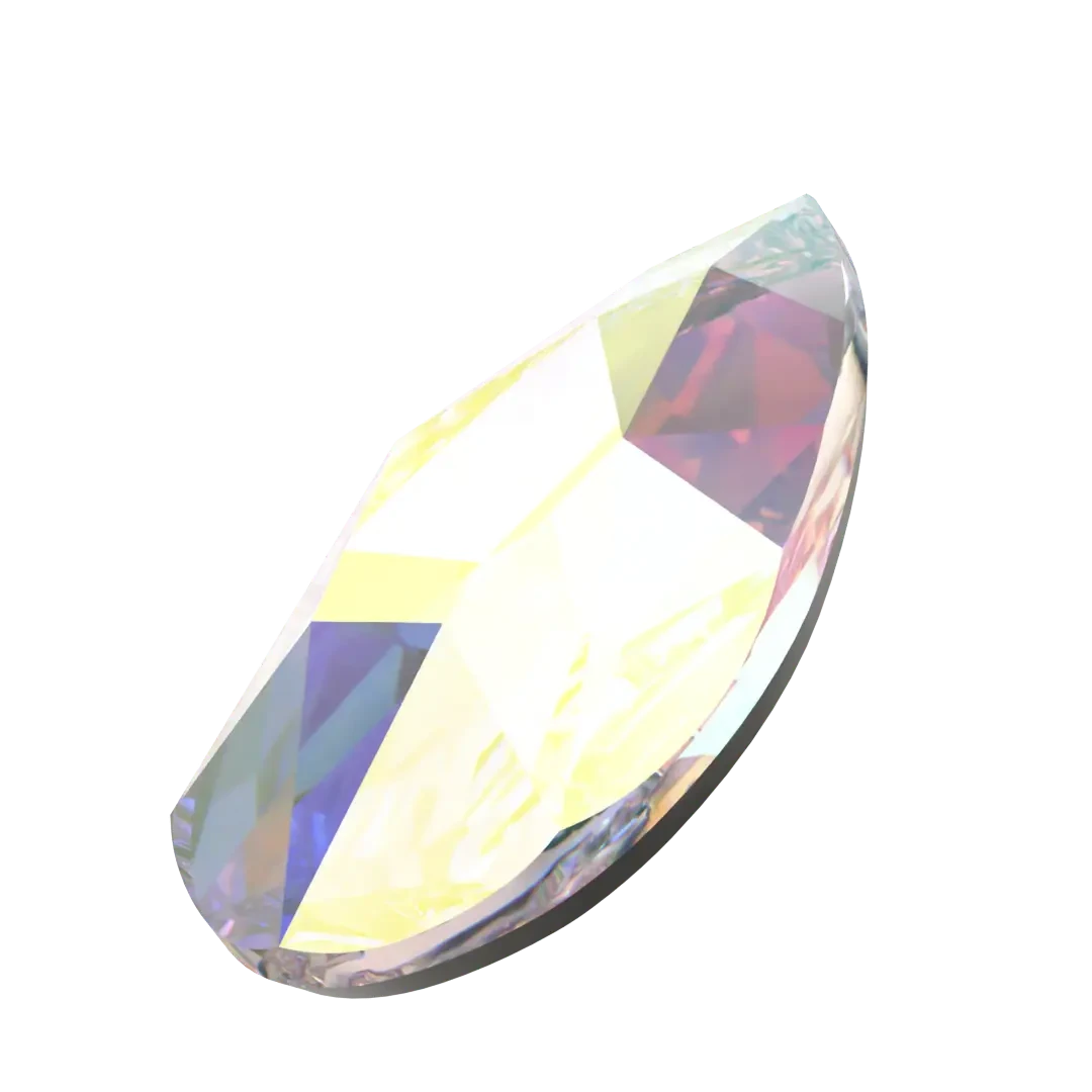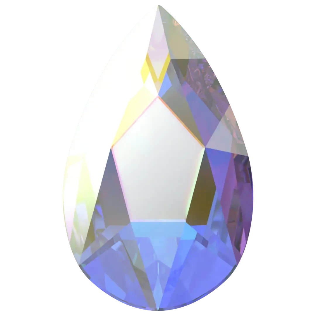 Serinity hotfix crystals Pear (2303) Crystal AB are flat back crystals where the reverse side of the crystal has been pre-coated with a heat-sensitive glue. Serinity Pear shaped crystals feature a tapered traditional pear shape with a rounded bottom and a pointed top, resulting in a symmetrical and elegant appearance. The crystal’s faceted surface is carefully cut to create a stunning and brilliant shine that sparkles from every angle.