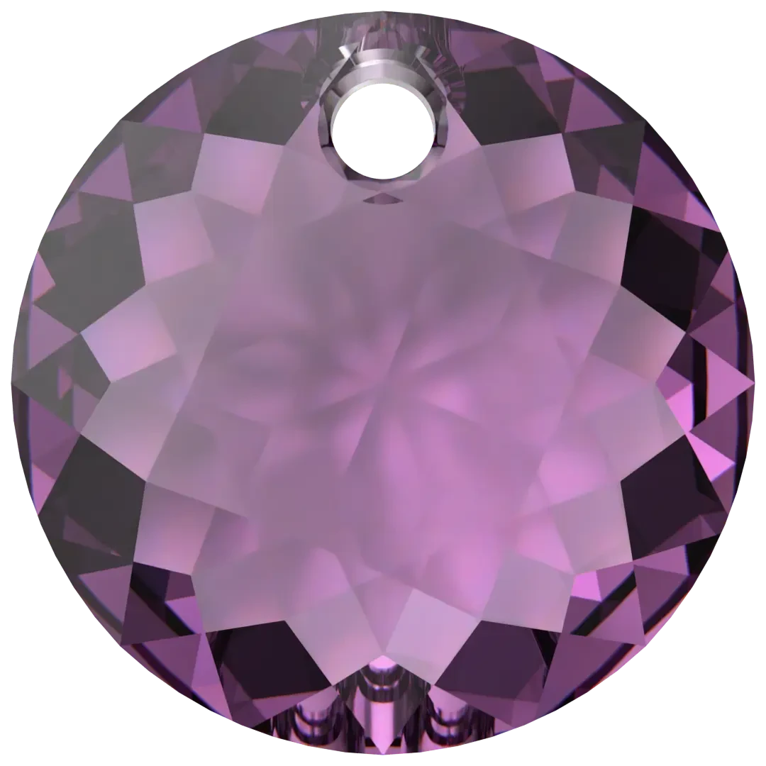 Serinity pendants Classic Cut (6430) in Amethyst are multi faceted crystals with a thread hole at the top enabling them to be attached to a chain or finding to create a piece of jewellery. Serinity Classic Cut crystal pendants have a circular shape with facets on both sides to capture and reflect the light magnificently. The facets of the crystal radiate from a flat centre on one side and a pointed centre on the opposite side.