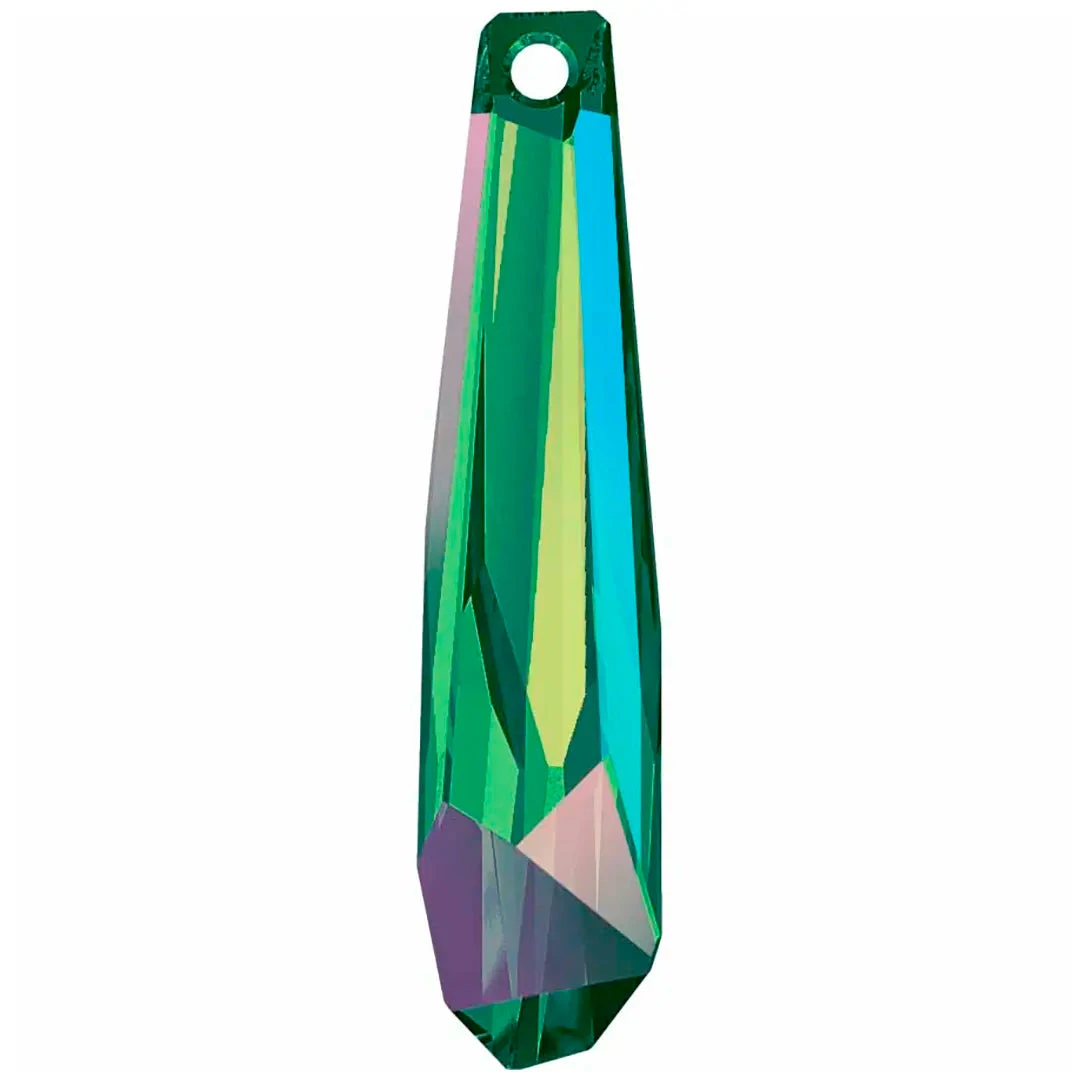 Serinity pendants Crystalactite (6017/G) in Crystal Vitrail Medium P are multi faceted crystals with a thread hole at the top enabling them to be attached to a chain or finding to create a piece of jewellery. Serinity Crystalactite shaped pendant, is a large, partially frosted pendant that resembles an icy stalactite. This unique design is characterized by its irregular shape and alternating shiny and matte facets, similar to the mesmerizing ice sculptures found in caves. With its bold, modern haute couture style, it is perfect for creating natural, organic looks with a touch of modern romance and exquisite sparkle.
