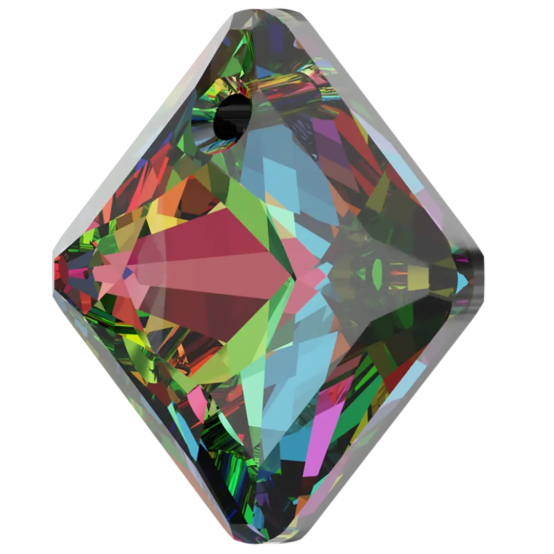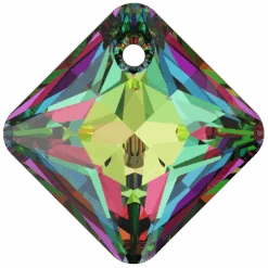 Serinity pendants Princess Cut (6431) in Crystal Vitrail Medium P are multi faceted crystals with a thread hole at the top enabling them to be attached to a chain or finding to create a piece of jewellery. Serinity Princess Cut shaped crystals feature a contemporary diamond cut that showcases a sharp and geometric square shape with clean, angular lines. These pendants are characterized by their four bevelled sides and pyramidal shape, adding an edgy and modern touch to any jewellery piece.