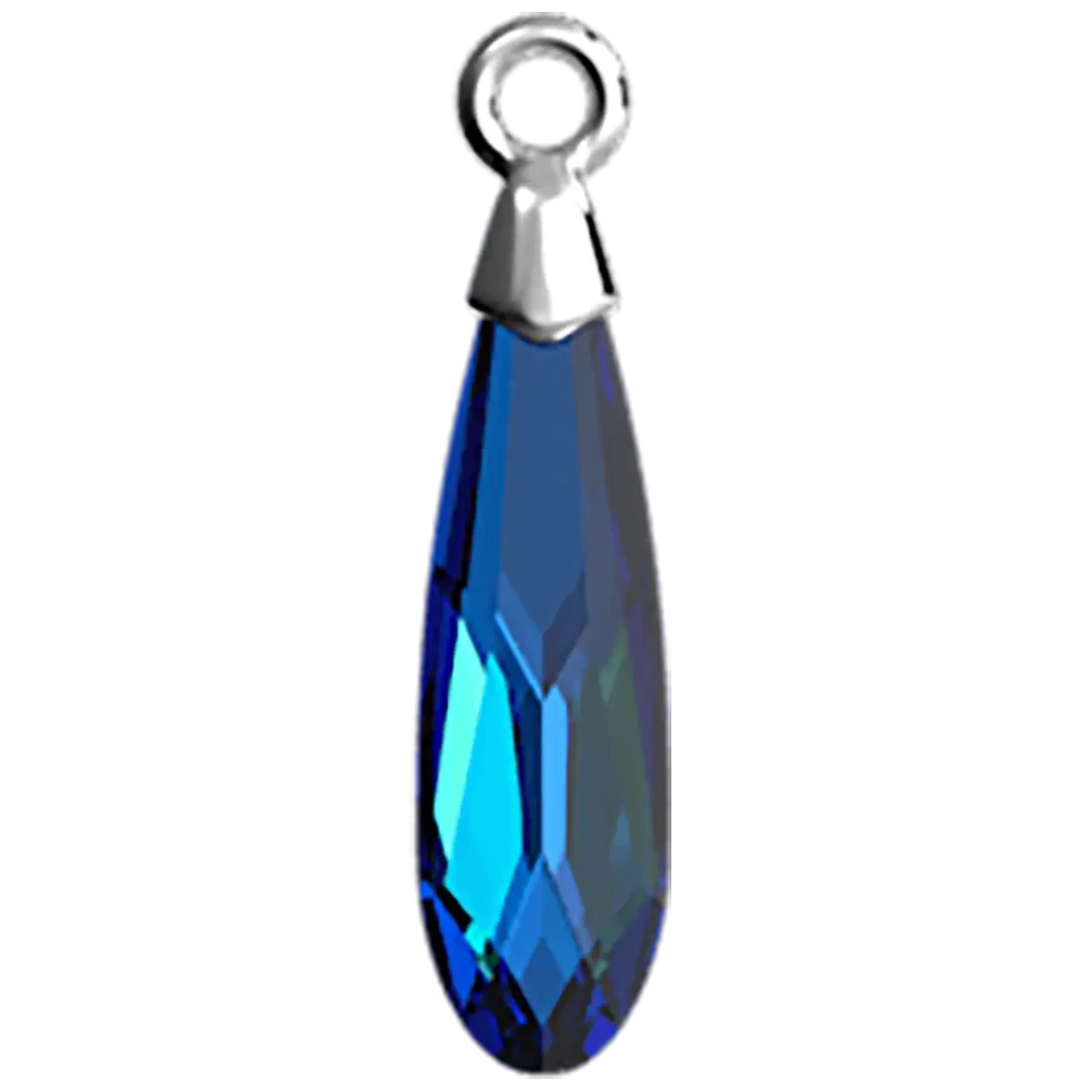 Serinity pendants Raindrop Rhodium Cap (6533) in Crystal Bermuda Blue are multi faceted crystals with a thread hole at the top enabling them to be attached to a chain or finding to create a piece of jewellery. Serinity pendant raindrop shape has been given a contemporary update with a metallic cap, making it a fresh and modern interpretation of a timeless design. The addition of the metallic cap provides a distinctive and cutting-edge touch. This pendant is distinct from traditional stone pendants that necessitate separate metal bails since it is a self-contained unit that can be effortlessly integrated into a variety of jewellery creations.