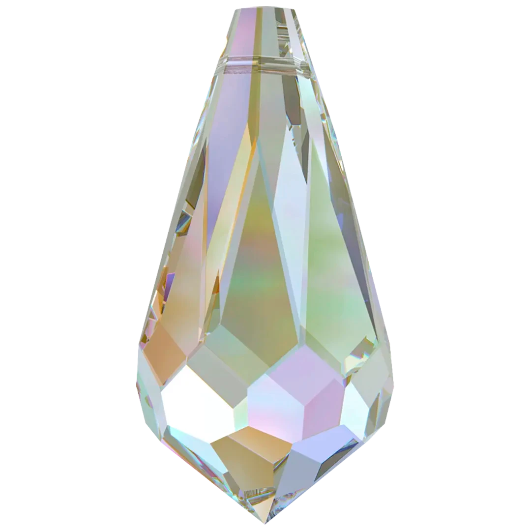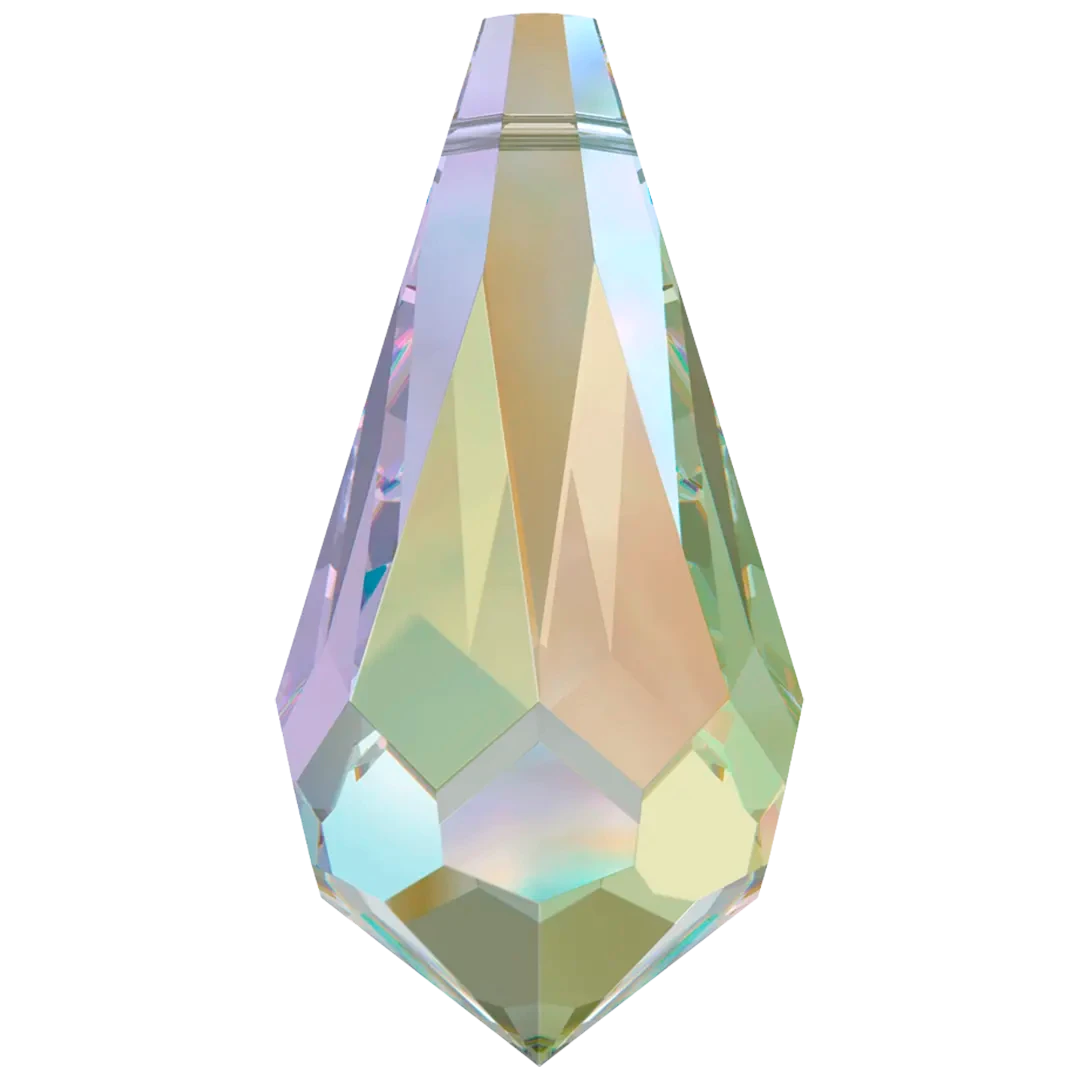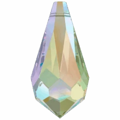 Serinity pendants Teardrop (6000) in Crystal Paradise Shine are multi faceted crystals with a thread hole at the top enabling them to be attached to a chain or finding to create a piece of jewellery. Serinity Teardrop stones are crystal components with a unique shape resembling a teardrop. These stones possess a slender apex and a broad base that tapers down to a delicate point, featuring symmetrical facets that reflect light in a magnificent manner.