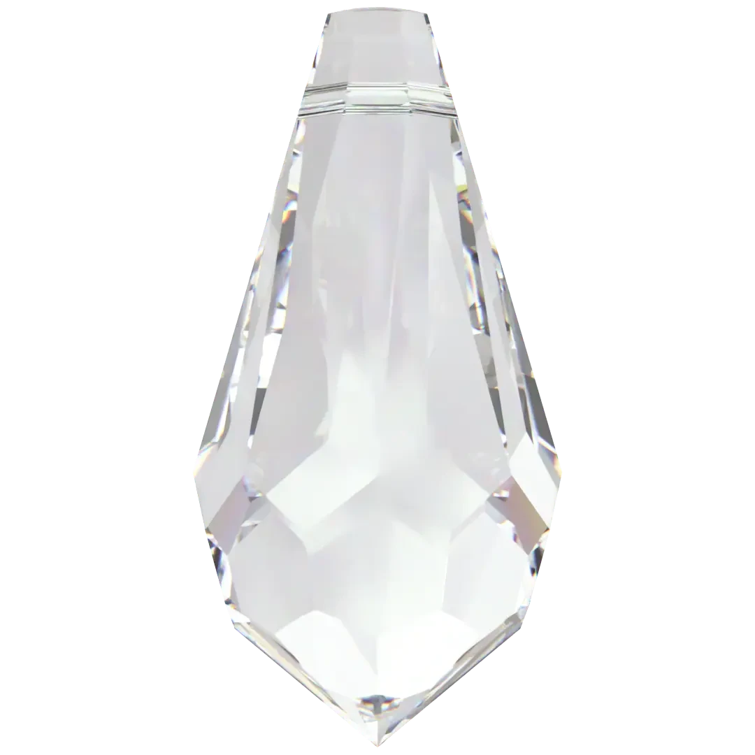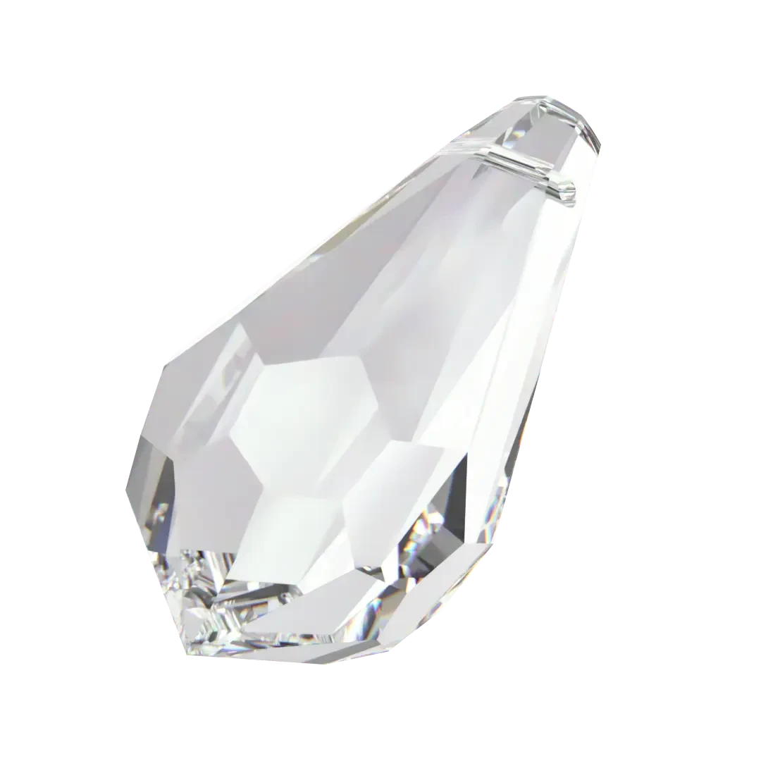 Serinity pendants Teardrop (6000) in Crystal are multi faceted crystals with a thread hole at the top enabling them to be attached to a chain or finding to create a piece of jewellery. Serinity Teardrop stones are crystal components with a unique shape resembling a teardrop. These stones possess a slender apex and a broad base that tapers down to a delicate point, featuring symmetrical facets that reflect light in a magnificent manner.