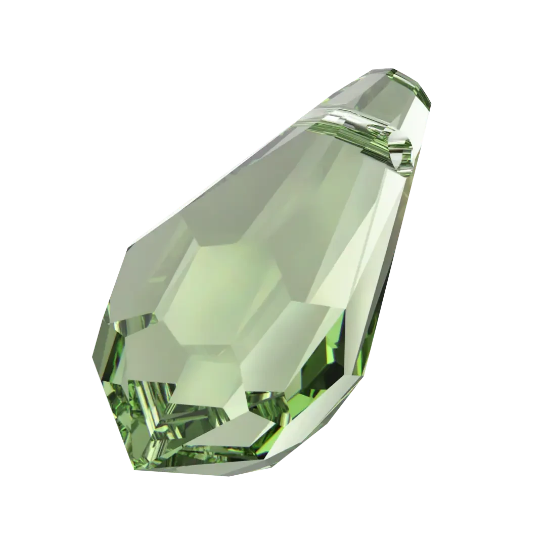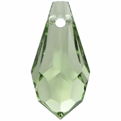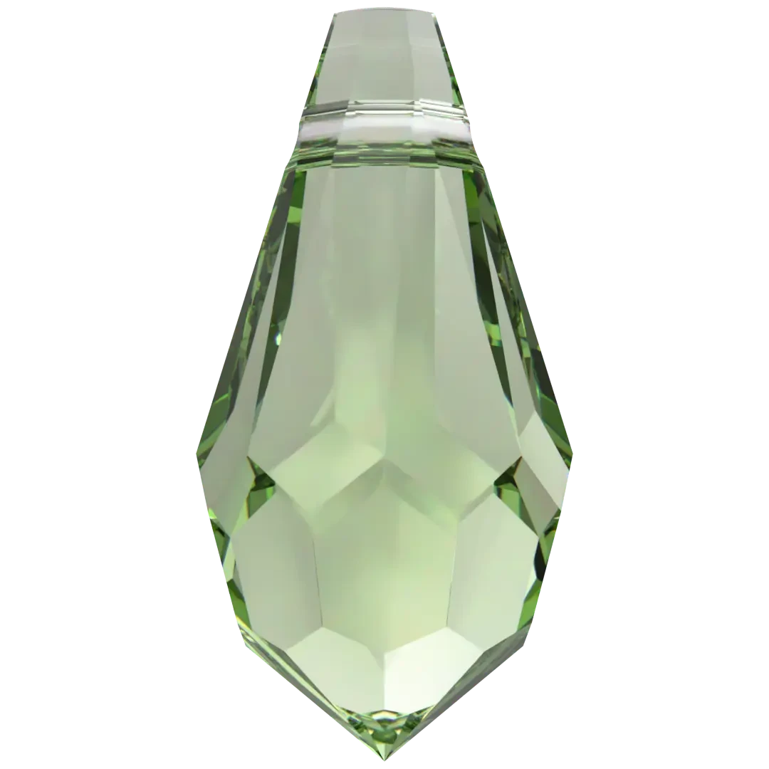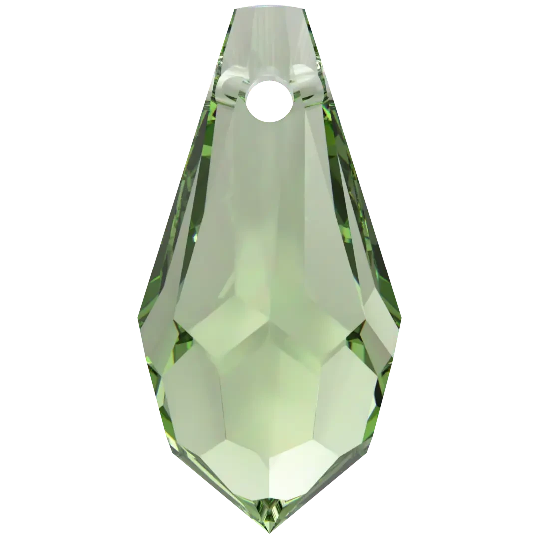 Serinity pendants Teardrop (6000) in Dark Peridot are multi faceted crystals with a thread hole at the top enabling them to be attached to a chain or finding to create a piece of jewellery. Serinity Teardrop stones are crystal components with a unique shape resembling a teardrop. These stones possess a slender apex and a broad base that tapers down to a delicate point, featuring symmetrical facets that reflect light in a magnificent manner.