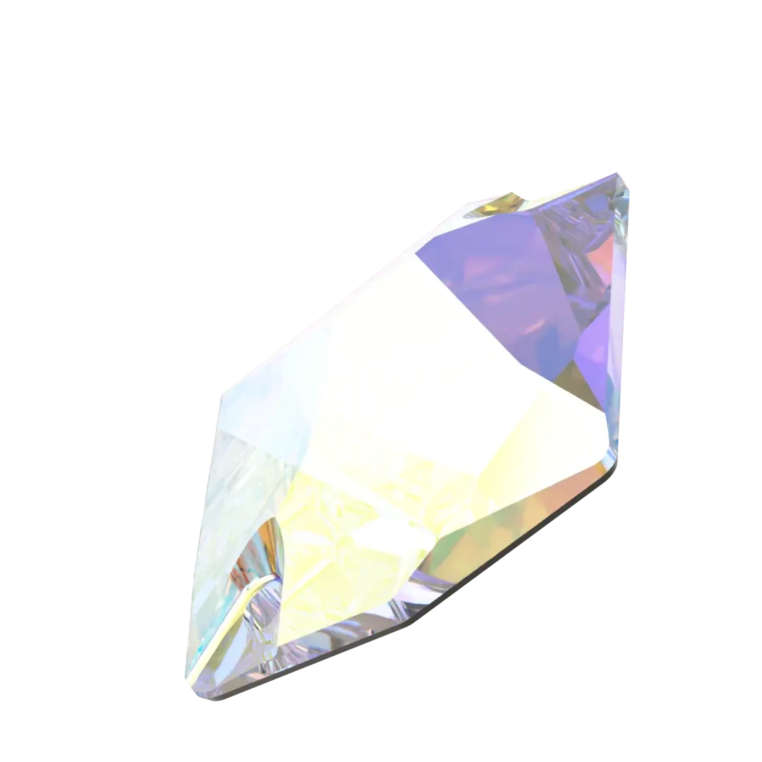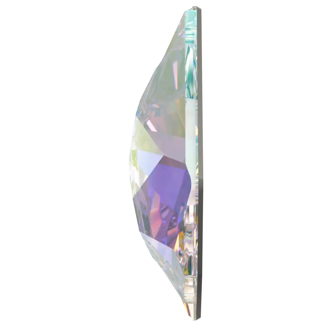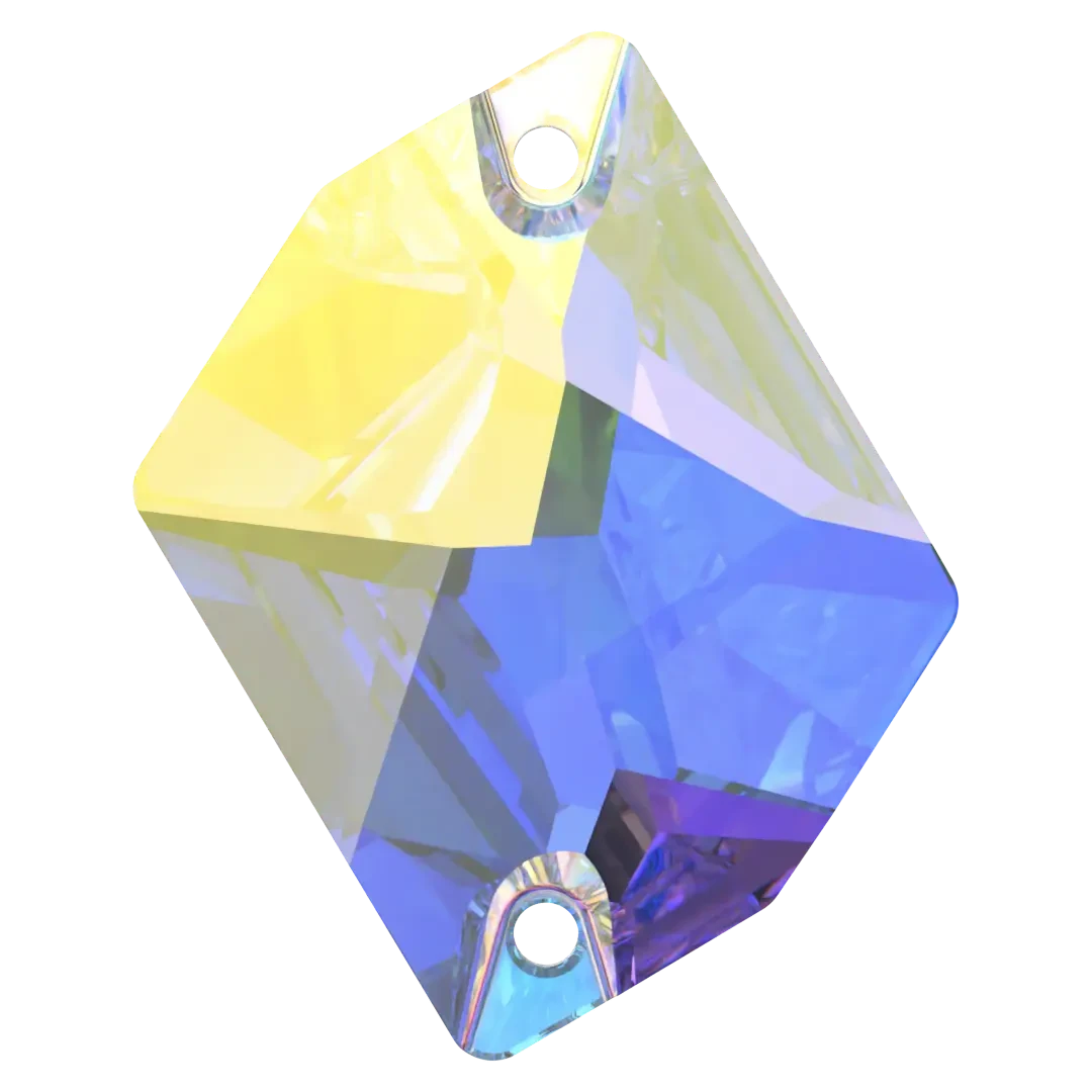 Serinity sew on crystals Cosmic (3265) in Crystal AB are loose flat backed crystals that come with a thread hole, enabling the crystals to be sewn onto fabric. Serinity Cosmic shaped crystals feature a rectangular shape with a raised centre that creates a 3D effect. The crystal surface is intricately cut with multiple facets, resulting in a dazzling sparkle. The cosmic shape is designed to resemble a cosmic explosion or a small galaxy, making it a distinctive and captivating element in any design.