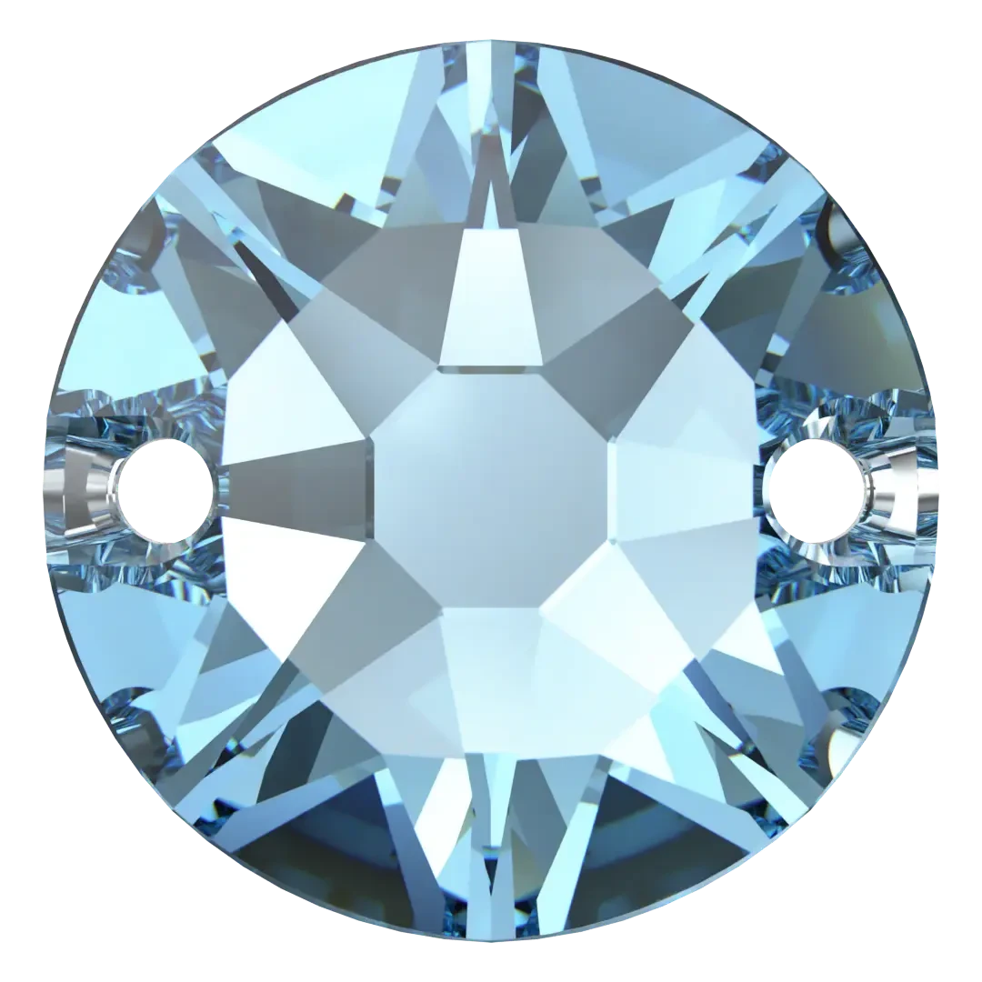 Serinity sew on crystals Round (3288) in Aquamarine are loose flat backed crystals that come with a thread hole, enabling the crystals to be sewn onto fabric. Serinity Round (2 Hole) sew on crystals are a circular crystal component that has two parallel holes positioned at the top and bottom of the stone. The sew-on has a flat back, which allows it to be easily attached to fabric or other materials, while its faceted front creates a sparkling and eye-catching effect.
