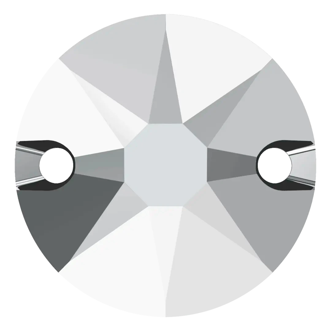 Serinity sew on crystals Round (3288) in Crystal Light Chrome are loose flat backed crystals that come with a thread hole, enabling the crystals to be sewn onto fabric. Serinity Round (2 Hole) sew on crystals are a circular crystal component that has two parallel holes positioned at the top and bottom of the stone. The sew-on has a flat back, which allows it to be easily attached to fabric or other materials, while its faceted front creates a sparkling and eye-catching effect.