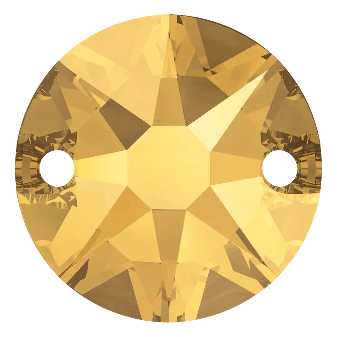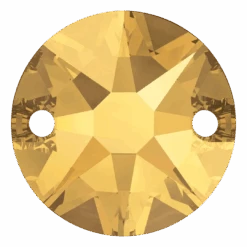 Serinity sew on crystals Round (3288) in Crystal Metallic Sunshine are loose flat backed crystals that come with a thread hole, enabling the crystals to be sewn onto fabric. Serinity Round (2 Hole) sew on crystals are a circular crystal component that has two parallel holes positioned at the top and bottom of the stone. The sew-on has a flat back, which allows it to be easily attached to fabric or other materials, while its faceted front creates a sparkling and eye-catching effect.