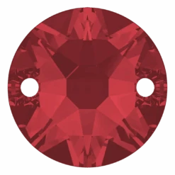 Serinity sew on crystals Round (3288) in Scarlet are loose flat backed crystals that come with a thread hole, enabling the crystals to be sewn onto fabric. Serinity Round (2 Hole) sew on crystals are a circular crystal component that has two parallel holes positioned at the top and bottom of the stone. The sew-on has a flat back, which allows it to be easily attached to fabric or other materials, while its faceted front creates a sparkling and eye-catching effect.