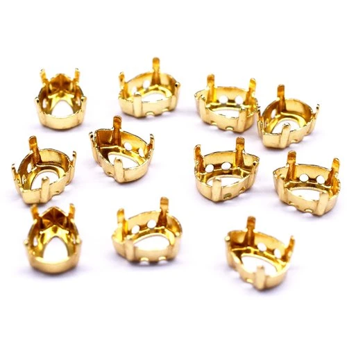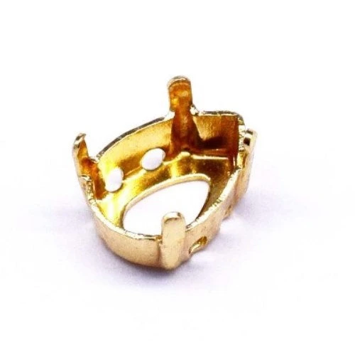 This gold colour sew-on setting for Baroque Pear fancy stones (including Swarovski 4320) is a type of jewellery finding that is used to attach a stone or crystal to fabric or clothing. The setting has small holes or prongs on either end, allowing it to be sewn onto the fabric with a needle and thread. The stone is then glued or set into the setting, creating a secure and decorative attachment to the fabric.