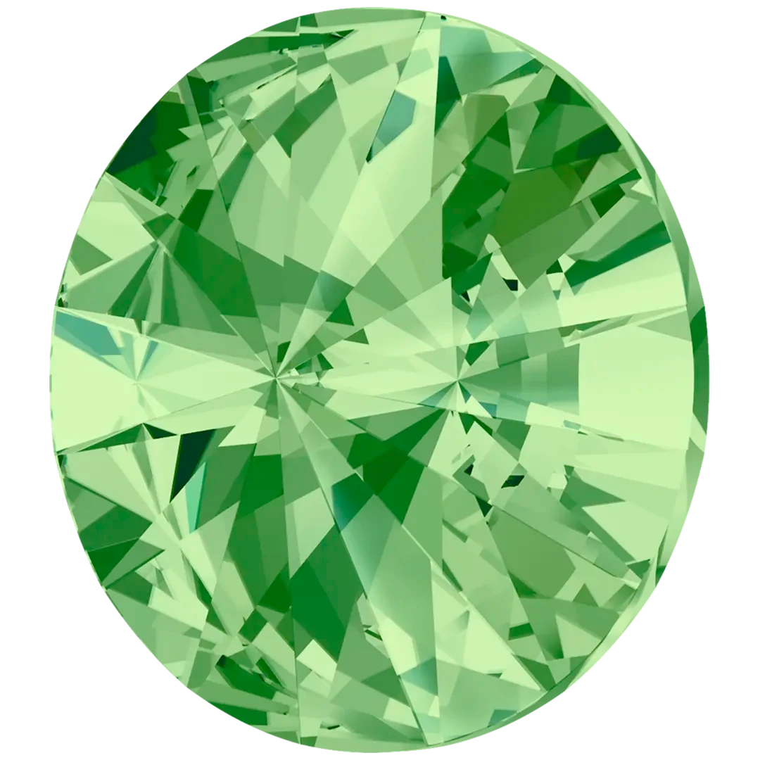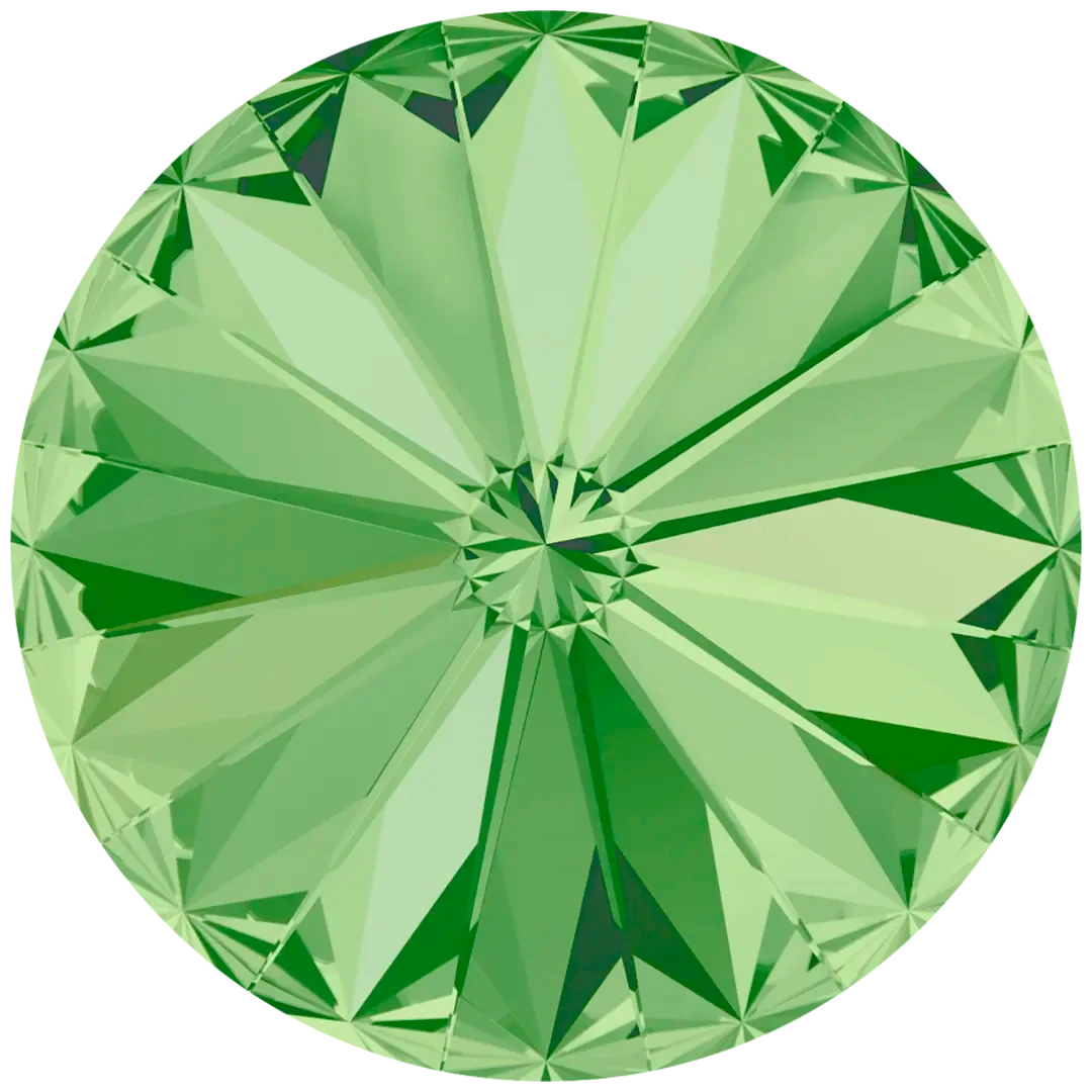 Swarovski chatons Rivoli (1122) in Peridot are multi faceted pointed back crystals that are used with metal settings to create bespoke jewellery and embellishment designs. Swarovski Rivoli shaped crystals are cut glass stones that have specifically cut facets which lead to a point. They are foiled on the underside of the crystal to reflect the light and enhance the colour of the stone.