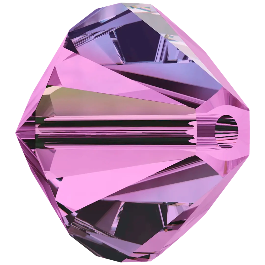 Swarovski crystal beads Xilion Bicone (5328) in Amethyst AB have a smooth thread hole and are multi-faceted to reflect the light, making them perfect to create bespoke designs. Swarovski Bicone beads are cylindrical in shape and taper at both ends to form a bi-conical shape. The tapered multi-faceted shape of bicone beads adds texture, dimension and sparkle to jewellery and bespoke designs.