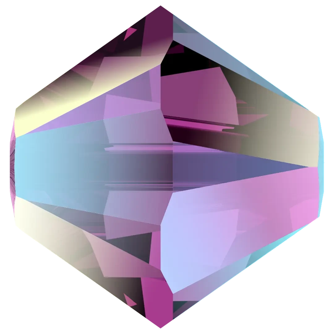 Swarovski crystal beads Xilion Bicone (5328) in Amethyst Shimmer 2X have a smooth thread hole and are multi-faceted to reflect the light, making them perfect to create bespoke designs. Swarovski Bicone beads are cylindrical in shape and taper at both ends to form a bi-conical shape. The tapered multi-faceted shape of bicone beads adds texture, dimension and sparkle to jewellery and bespoke designs.