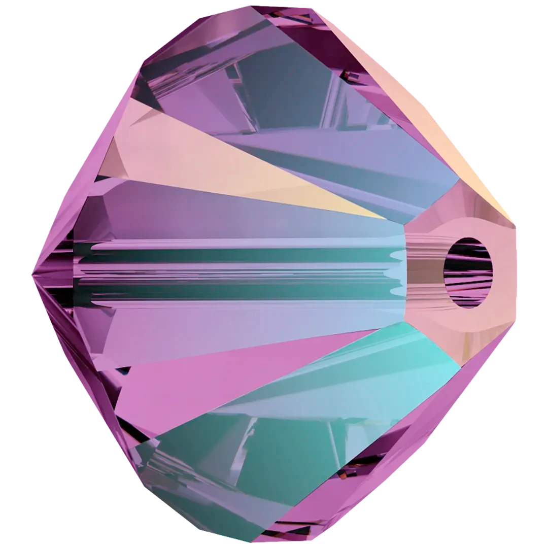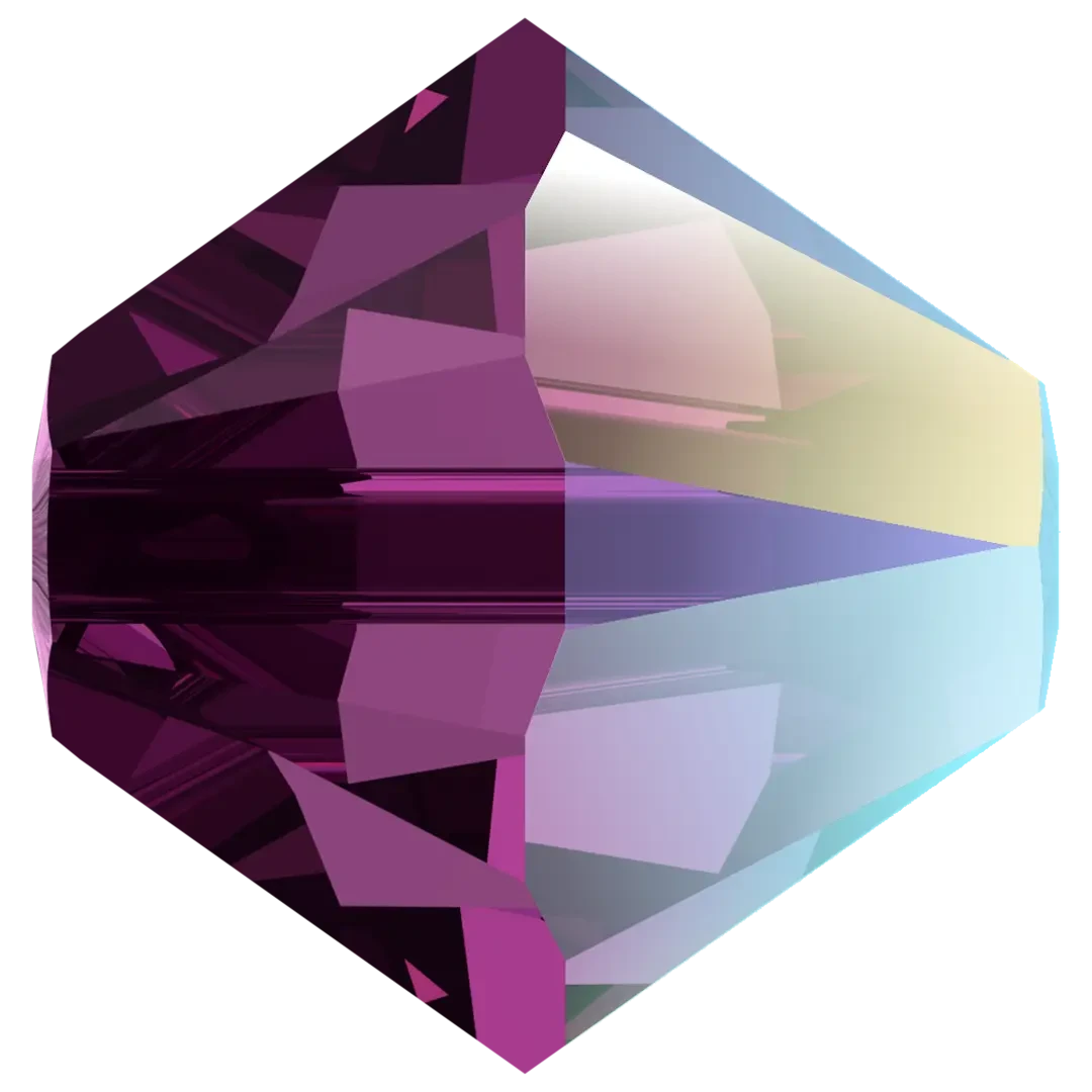 Swarovski crystal beads Xilion Bicone (5328) in Amethyst Shimmer have a smooth thread hole and are multi-faceted to reflect the light, making them perfect to create bespoke designs. Swarovski Bicone beads are cylindrical in shape and taper at both ends to form a bi-conical shape. The tapered multi-faceted shape of bicone beads adds texture, dimension and sparkle to jewellery and bespoke designs.