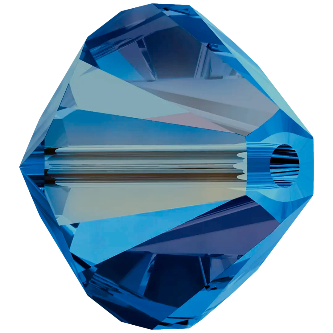 Swarovski crystal beads Xilion Bicone (5328) in Capri Blue AB have a smooth thread hole and are multi-faceted to reflect the light, making them perfect to create bespoke designs. Swarovski Bicone beads are cylindrical in shape and taper at both ends to form a bi-conical shape. The tapered multi-faceted shape of bicone beads adds texture, dimension and sparkle to jewellery and bespoke designs.