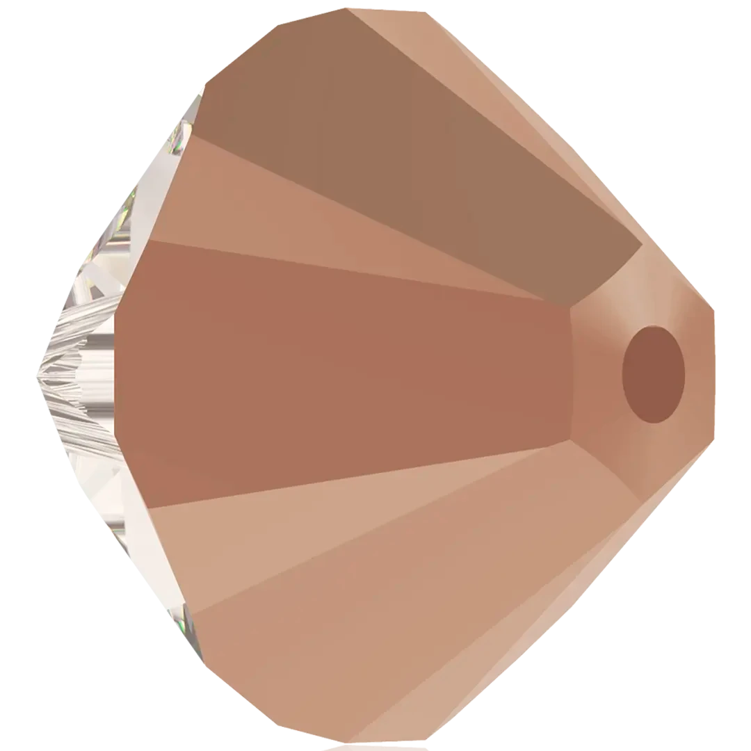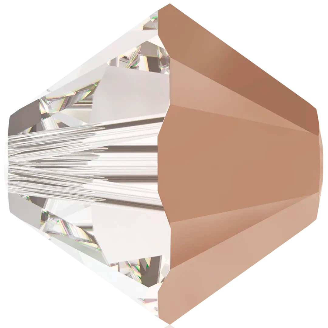 Swarovski crystal beads Xilion Bicone (5328) in Crystal Rose Gold have a smooth thread hole and are multi-faceted to reflect the light, making them perfect to create bespoke designs. Swarovski Bicone beads are cylindrical in shape and taper at both ends to form a bi-conical shape. The tapered multi-faceted shape of bicone beads adds texture, dimension and sparkle to jewellery and bespoke designs.
