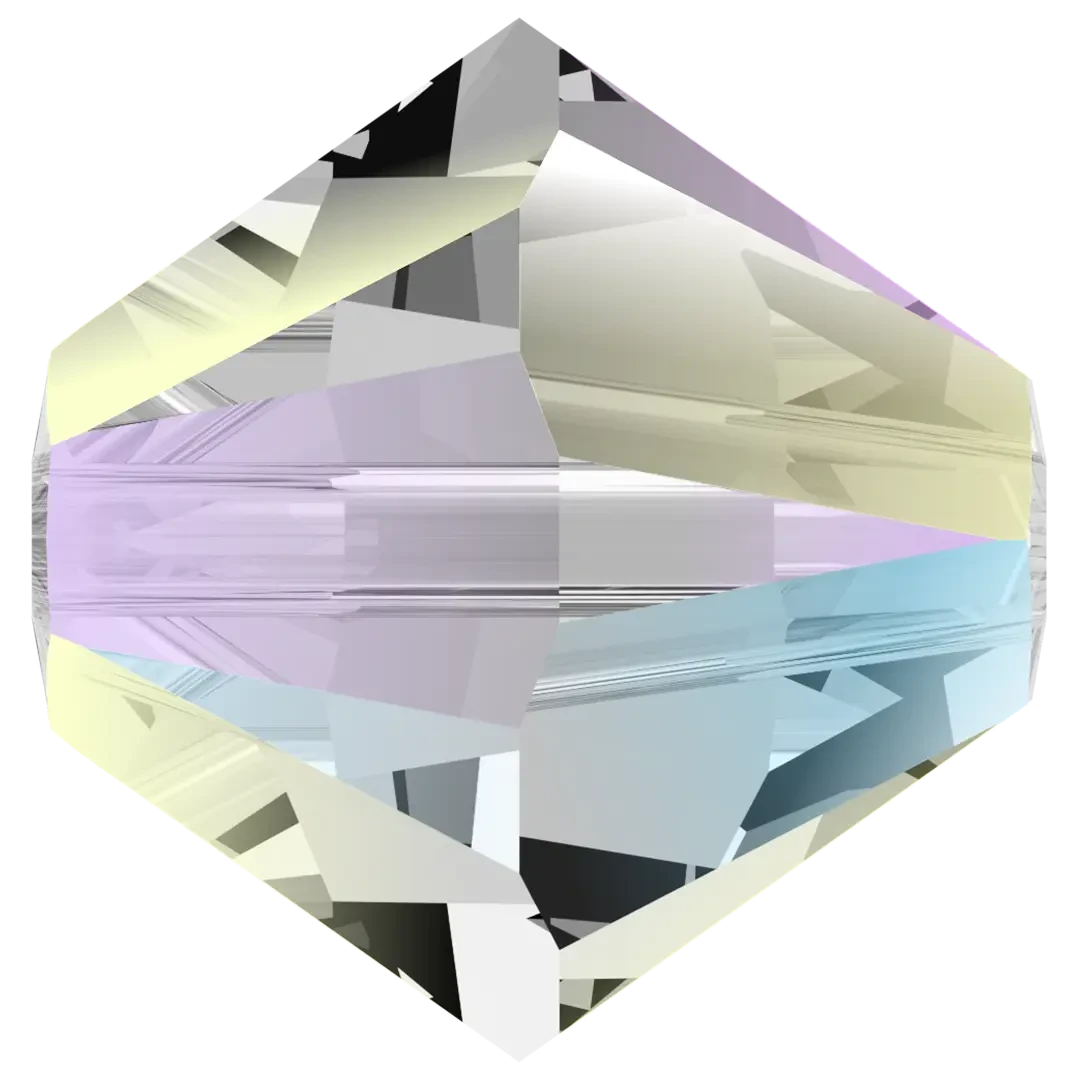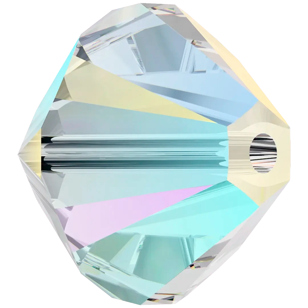 Swarovski crystal beads Xilion Bicone (5328) in Crystal Shimmer 2X have a smooth thread hole and are multi-faceted to reflect the light, making them perfect to create bespoke designs. Swarovski Bicone beads are cylindrical in shape and taper at both ends to form a bi-conical shape. The tapered multi-faceted shape of bicone beads adds texture, dimension and sparkle to jewellery and bespoke designs.